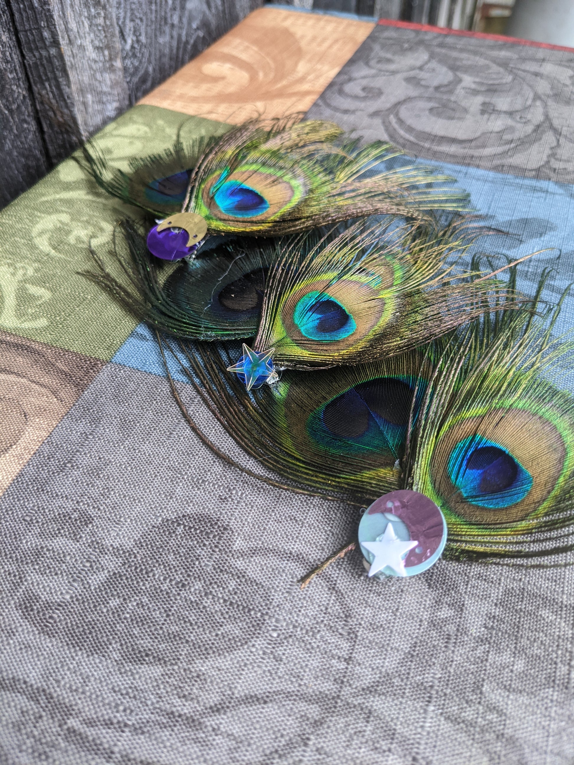 Bold and beautiful describes the look you'll get with these hair accessories! Each clip is made with a trio of real peacock feathers and jazzed up with a few sequins (colors vary, feel free to specify colors you would like!). The clip is available alligator-style, so you can attach it easily just about anywhere. We also offer as a barrette clip, using a two-inch metal barrette. We've shown it here as a hair accessory, but the options are endless...clip it to a headband to make your own fascinator, attach to your favorite hat for a unique upgrade! The natural iridescence of these feathers means they will appear blue, green, gold, or even purple depending on the light, so they are sure to attract attention anywhere! These hair accessories were made right here at Pleasant Valley Farm, where we raise peafowl (peacock refers to the male birds only). Our birds molt, or shed their feathers, once per year. I hand collect the feathers and transform them into accessories, jewelry and art you can feel good about purchasing, knowing that it is 100% cruelty free. Our birds have a year-round outdoor enclosure and access to shelter in our historic barn, which was built in 1894. The pen is roadside at our beautiful farm, so if you're in the neighborhood, you can see the actual birds who produced these feathers!
