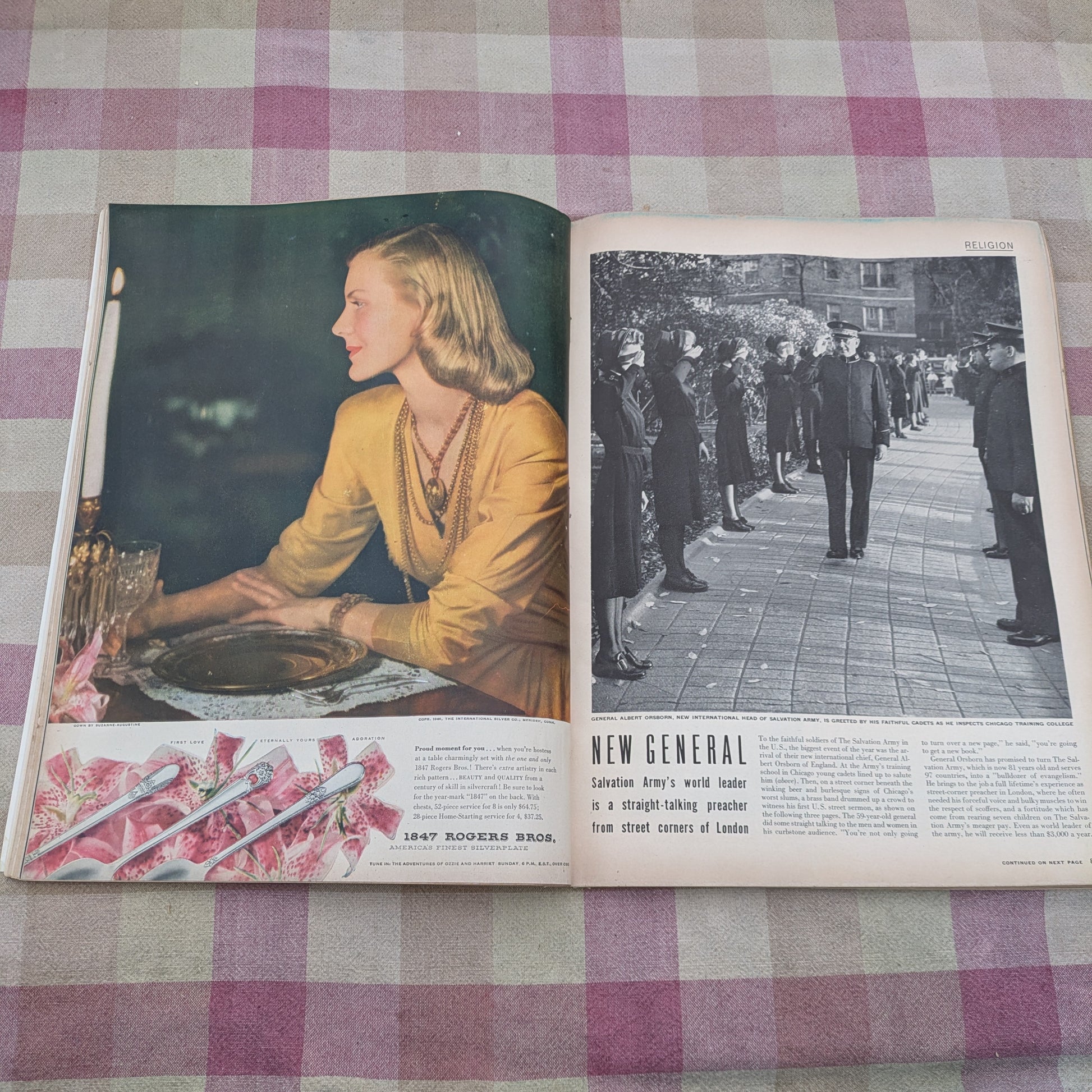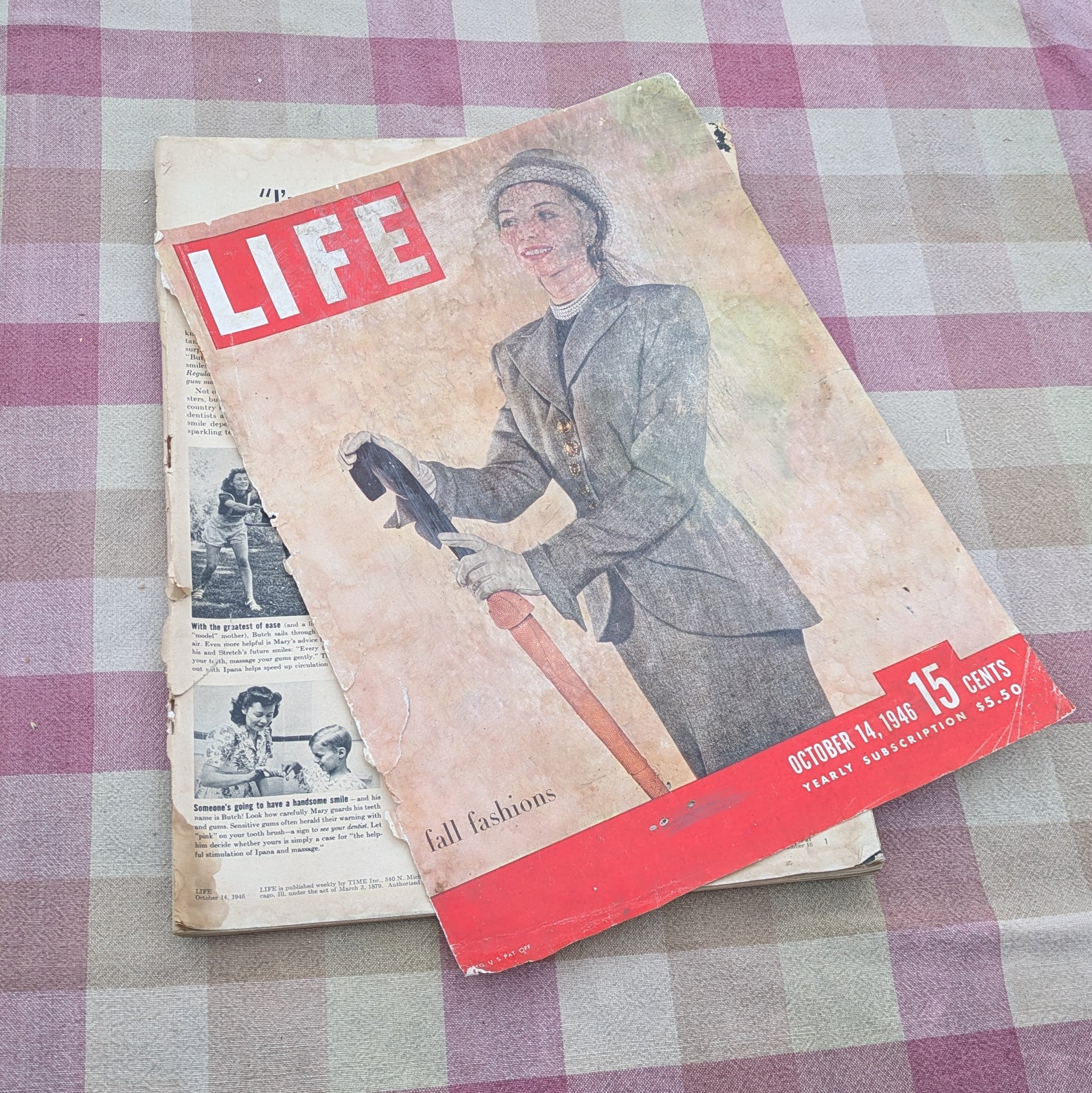 12 vintage Life magazines, dating from October -December 1946. Issues include: October 7, 14, 21 & 28, November 4, 11, 18, & 25, and December 9, 16, 25 & 30, including the 10th Anniversary Issue. These magazines from the post World War II era show a quick return to everyday life, with these issues featuring women, children, pets and leisure. The articles continue to have political features as well as articles about fashion, art, entertainment and Americana. The vintage ads feature full pages in full color. Fascinating for anyone who is interested in WW2 history or mid century trends.