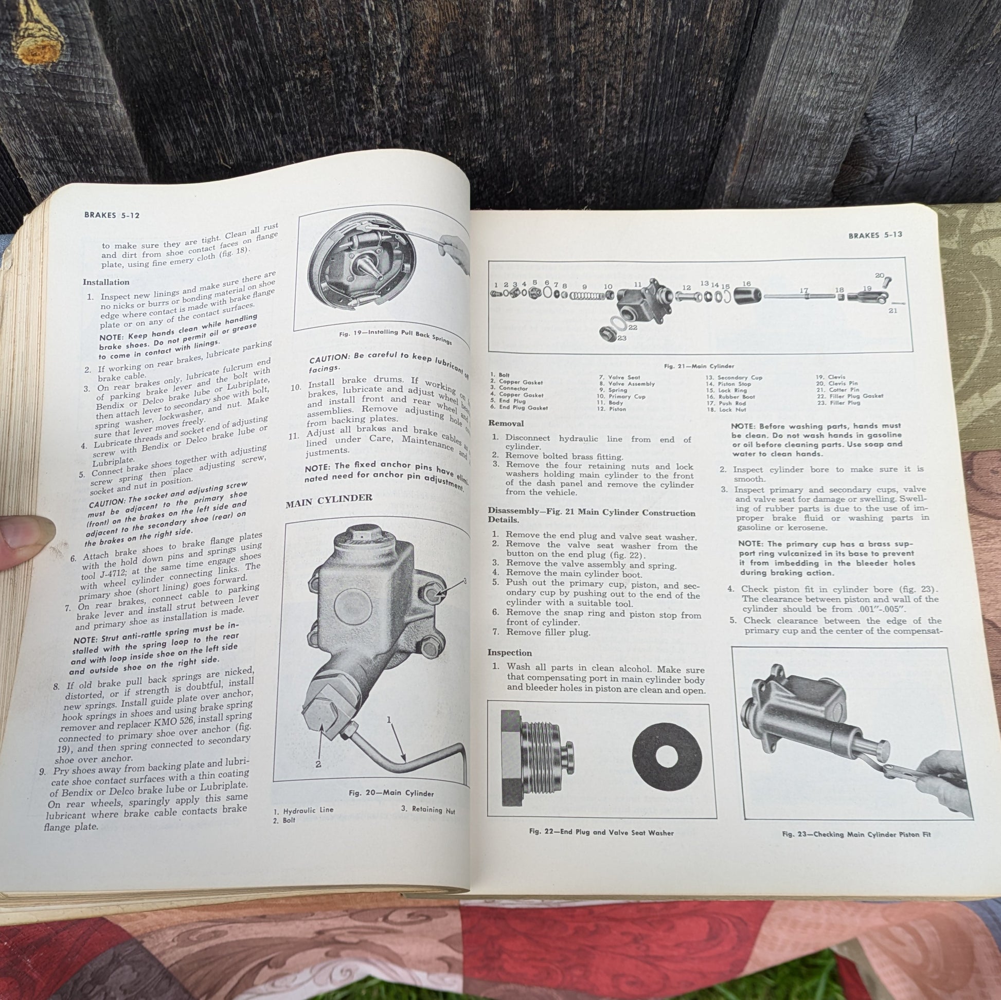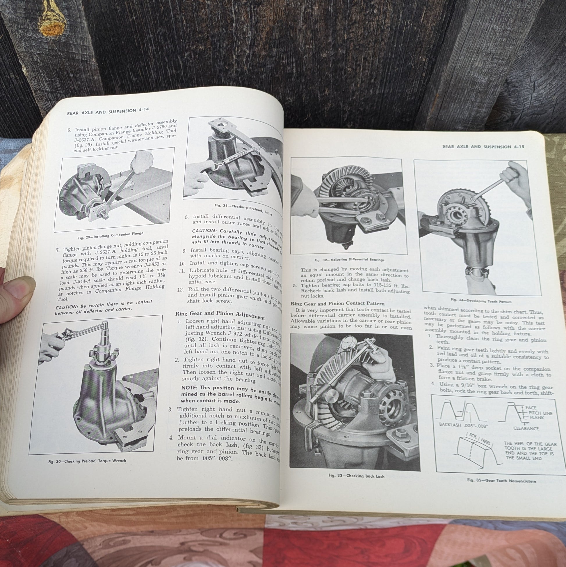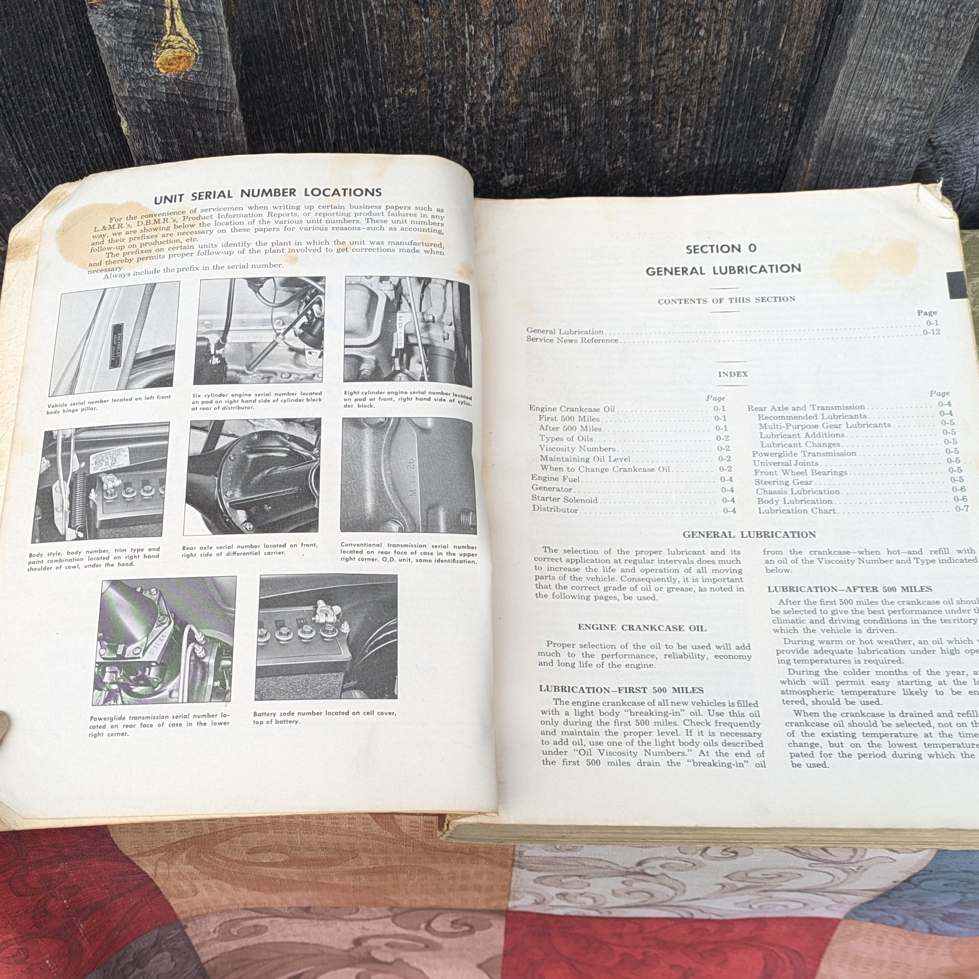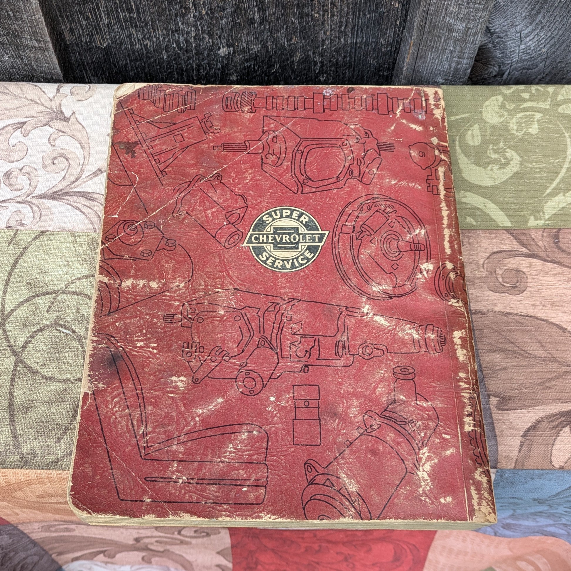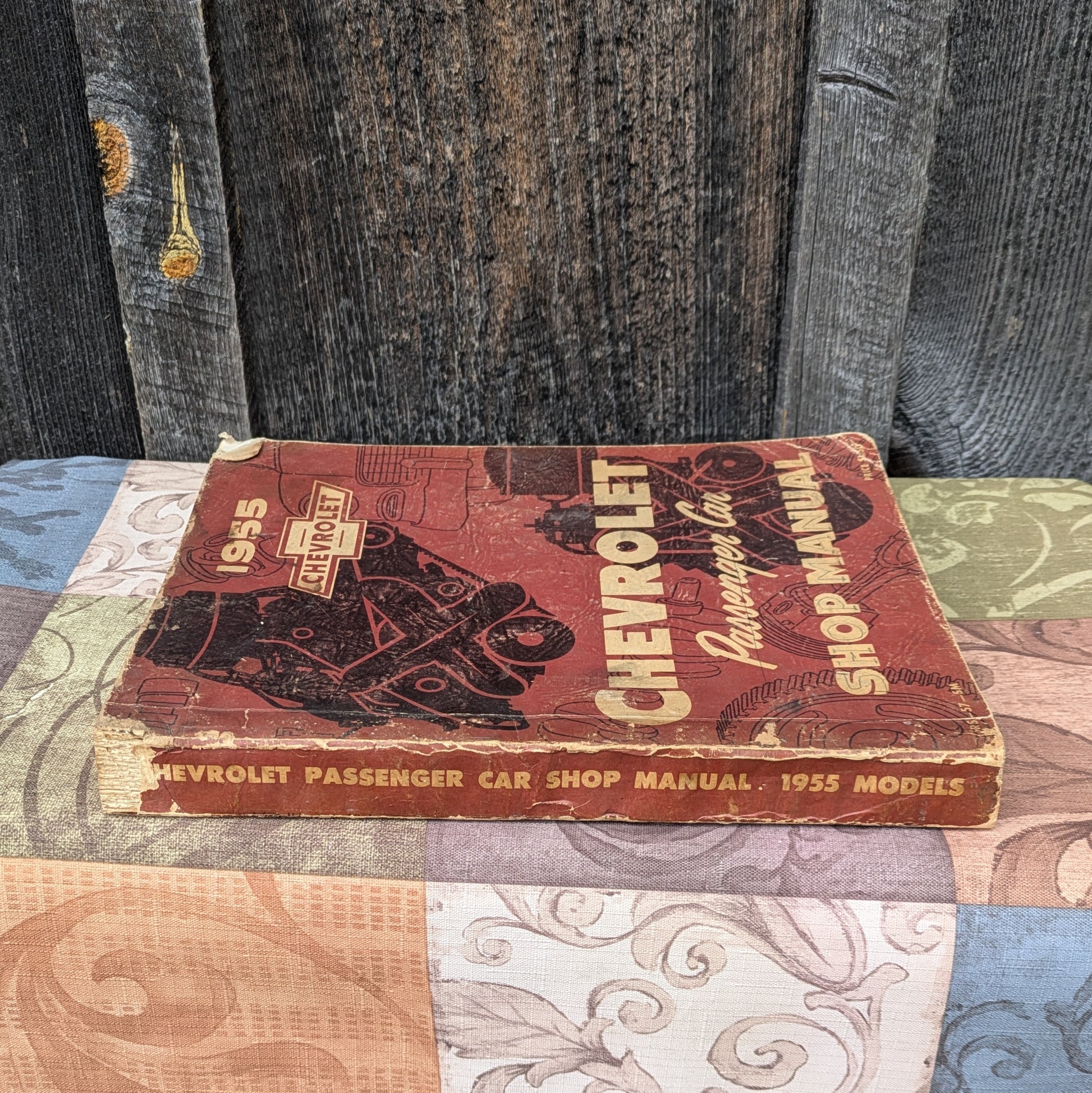 Genuine vintage 1955 Chevrolet Shop Manual. Not a reprint. Contains black and white photos and diagrams throughout. Appears to have been intended as a dealership or service station staff training and reference manual. It covers body, frame, suspension, brakes, engine, transmission, wheels, electrical, and more