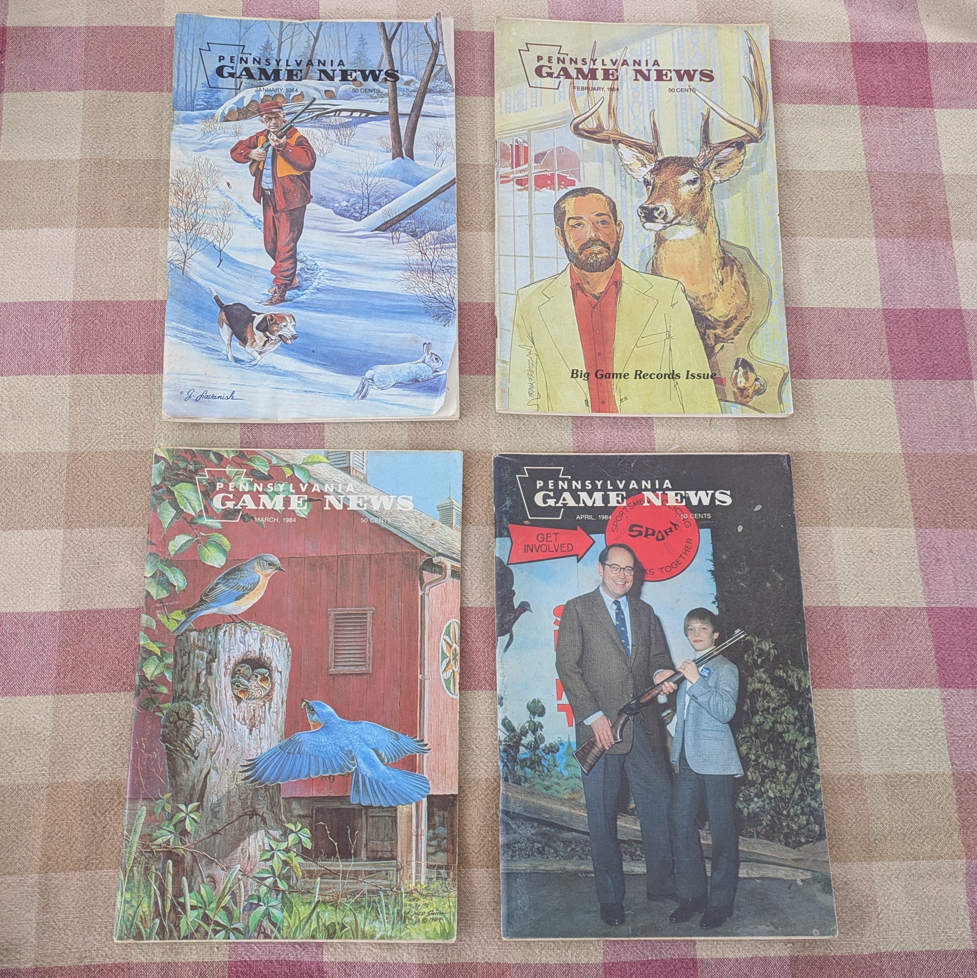 Set of 12 vintage Pennsylvania Game News magazines, all 12 months of 1984. All issues feature full color cover artwork or photography. Features black and white illustrations and photos inside. They feature articles on Pennsylvania game animals, hunting stories, changes to regulations, history and more. Great decor or reading material for cabins, camps, and lodges!