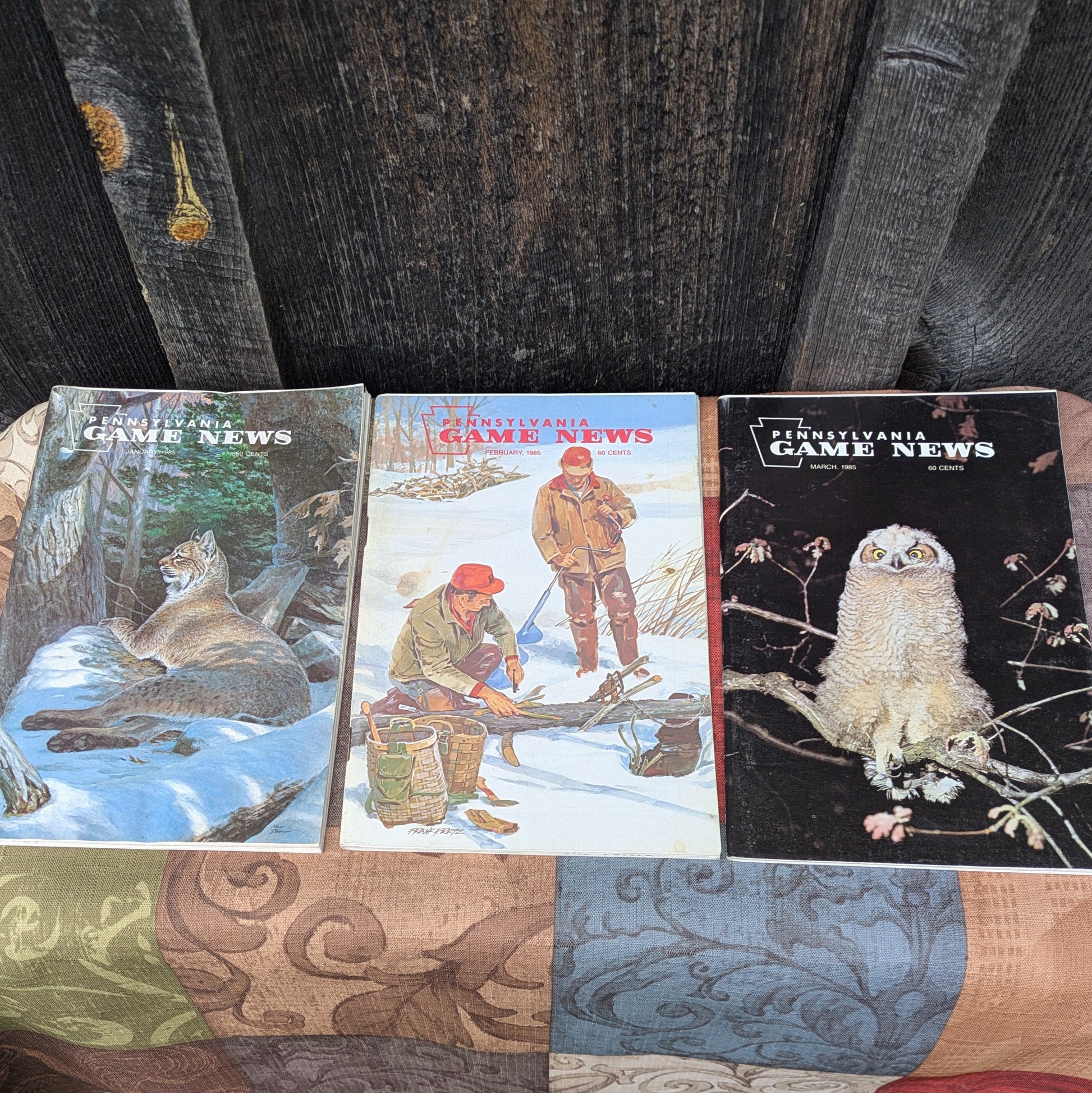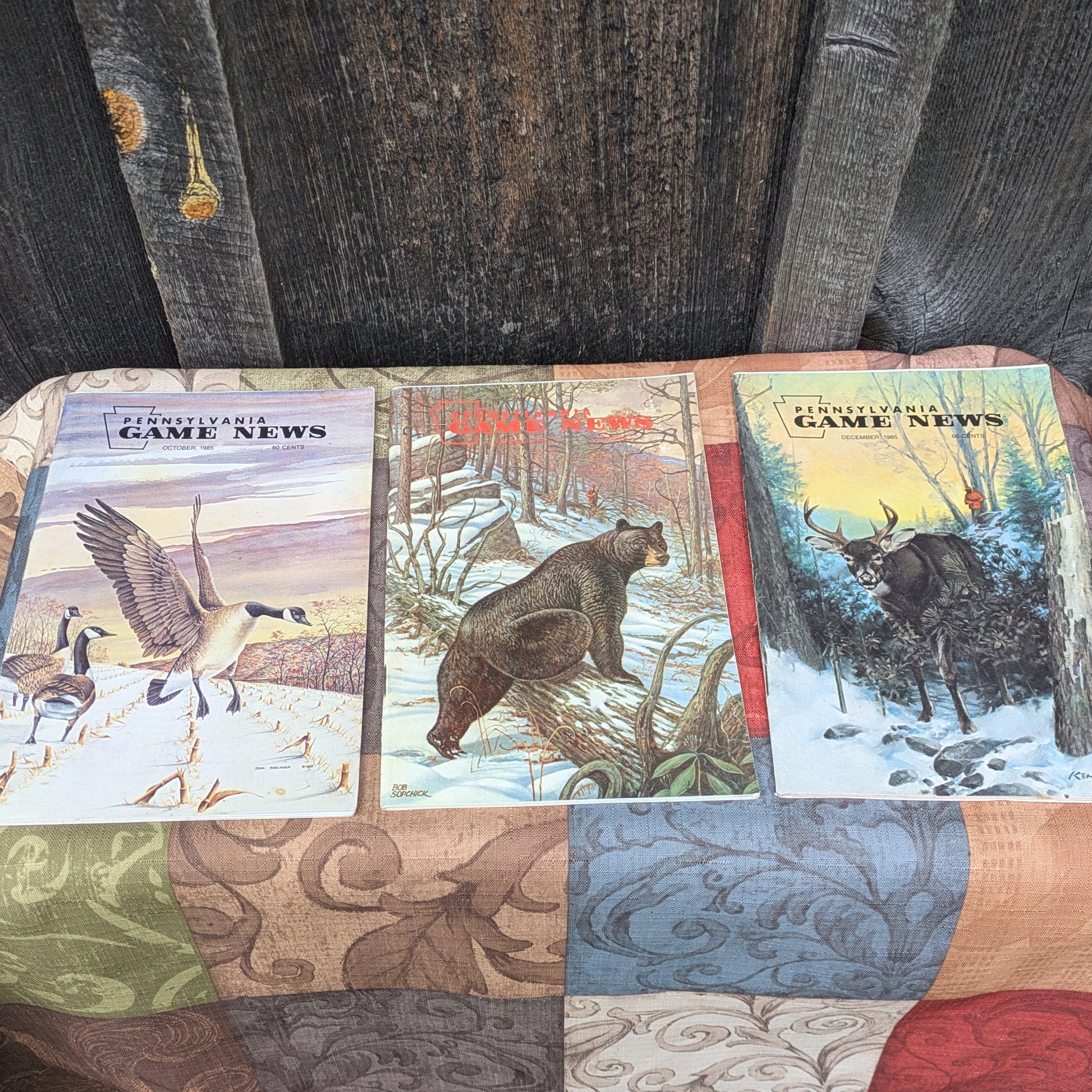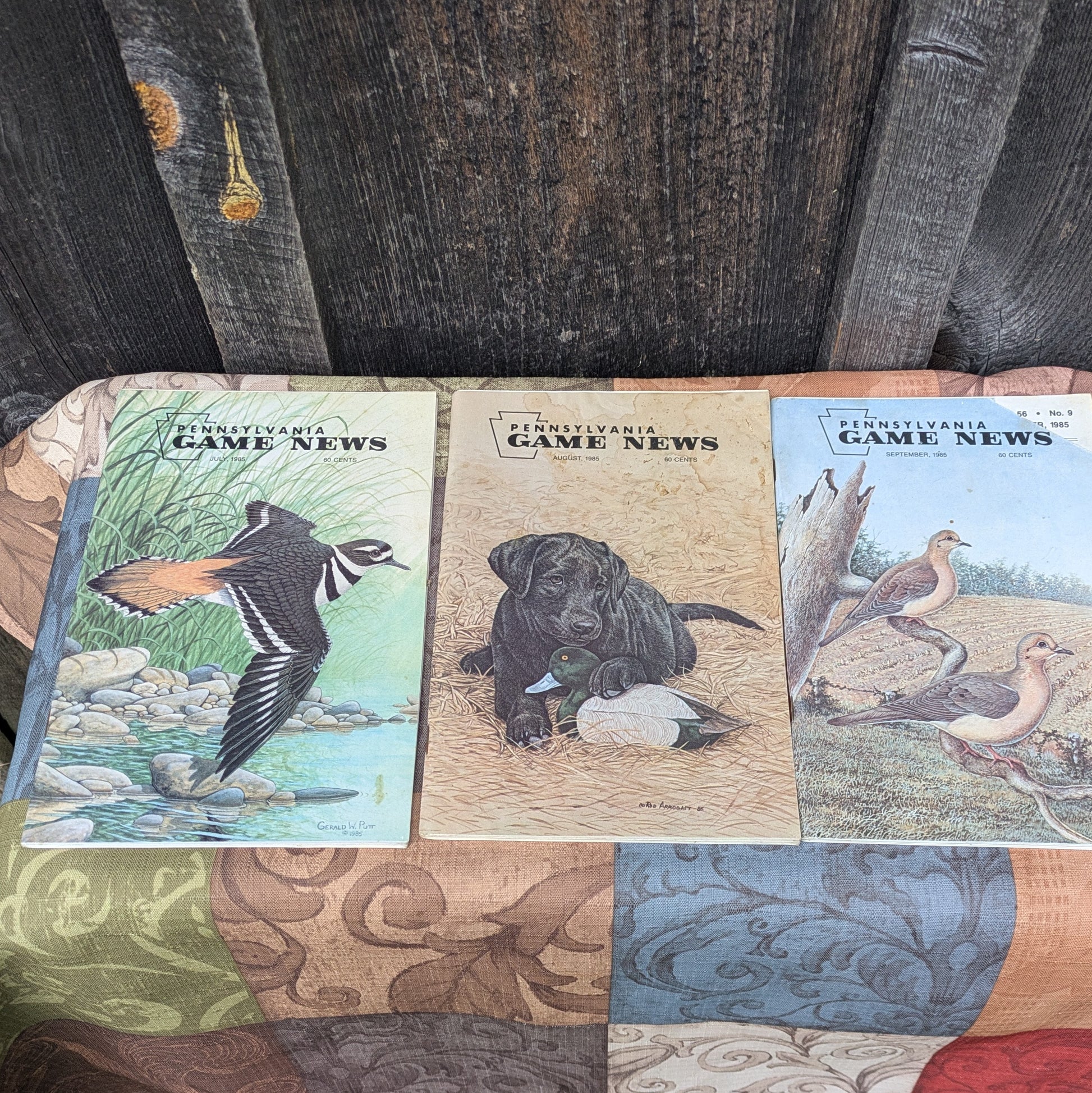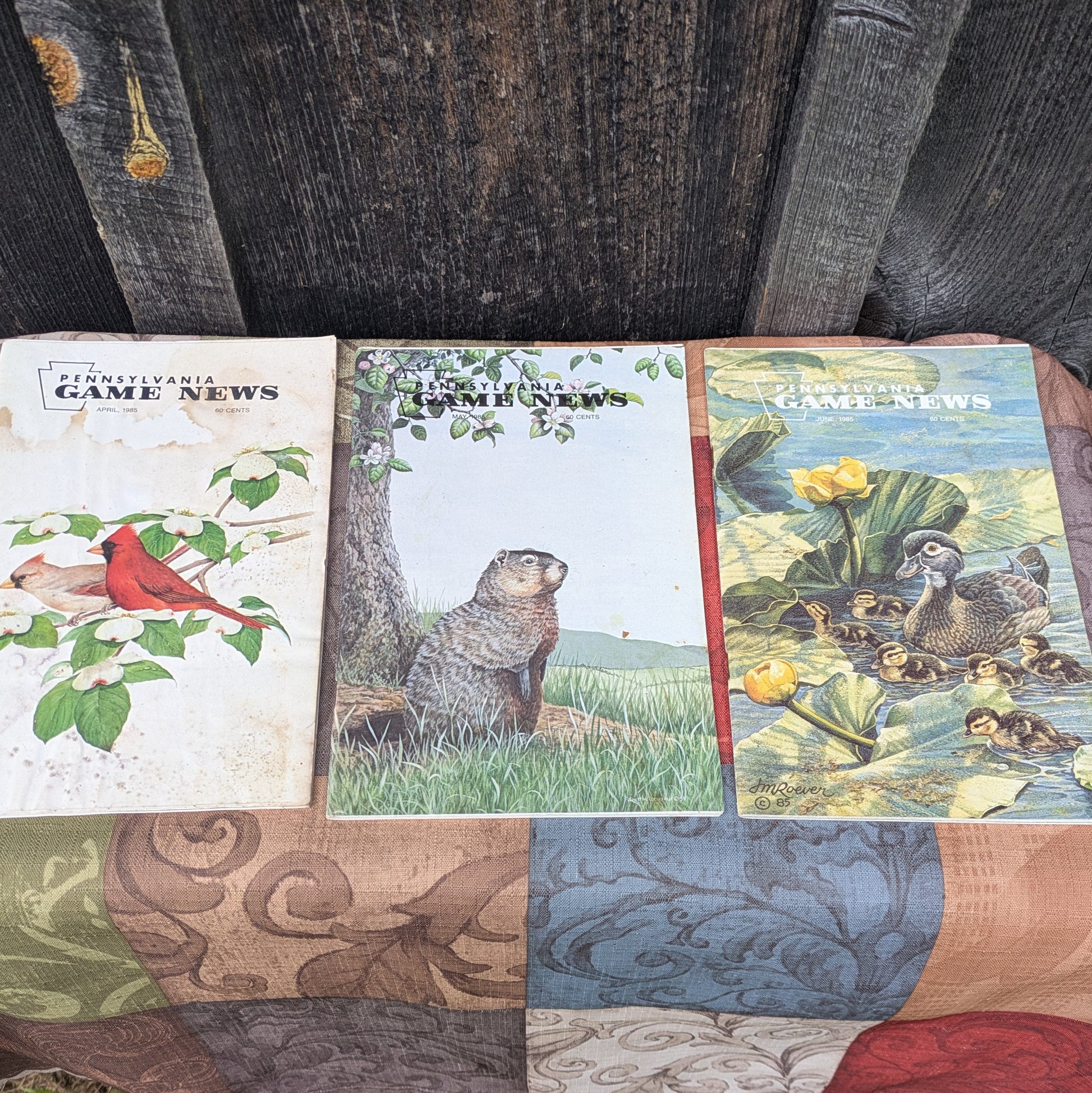Set of 12 vintage Pennsylvania Game News magazines, all 12 months of 1985. All issues feature full color cover artwork or photography. Features black and white illustrations and photos inside. They feature articles on Pennsylvania game animals, hunting stories, changes to regulations, history and more. Great decor or reading material for cabins, camps, and lodges!