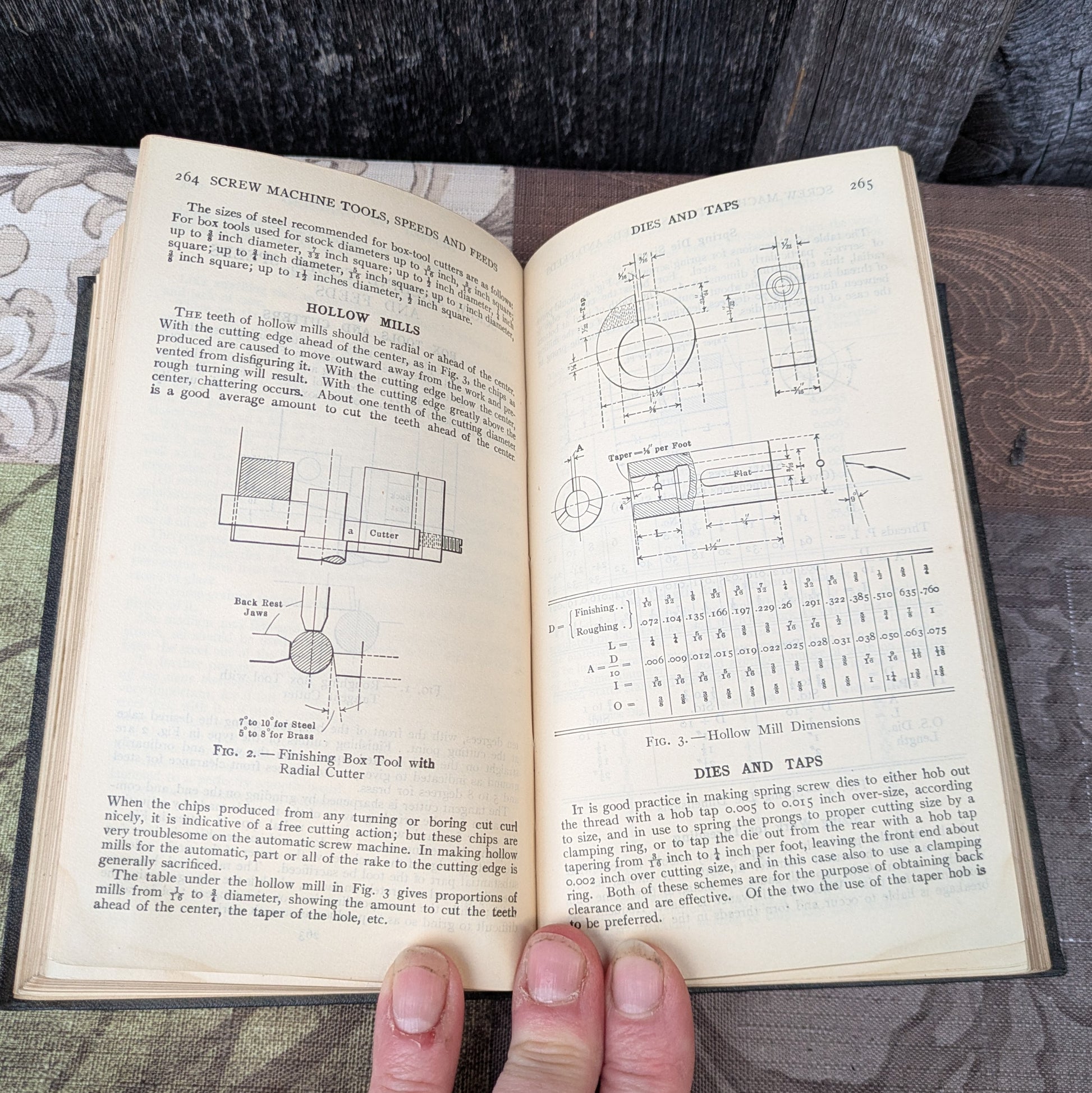 1924 edition of American Machinists' Handbook and Dictionary of Shop Terms: A reference book of machine shop and drawing room data, methods and definitions by Fred H. Colvin and Frank A. Stanley. This is a third edition, sixth impression of a book originally published in 1908. Covers screw threads, pipe and pipe threads, twist drills, taps, files, work benches, soldering, gearing, milling, turning and boring, grinding and lapping, oil stones, nuts and bolts, calipering and fitting, and more. 756 pages including index. Contains black and white illustrations, diagrams, tables and charts throughout.