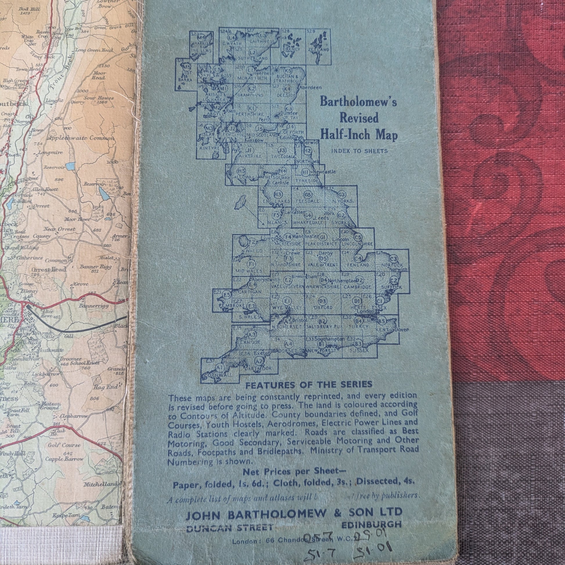 Bartholomew's One Inch Map of the Lake District for Pedestrians contains one map, about 30" x 33.5". It is called a one-inch map as 1" on the map equals one mile. Shows Lake Windmere and surrounding areas. Map has wear as shown to folded map corners. Sticker from Sam Read, Bookseller on front as shown .The colors are still very nice, it would make a great display piece if you choose to frame it.