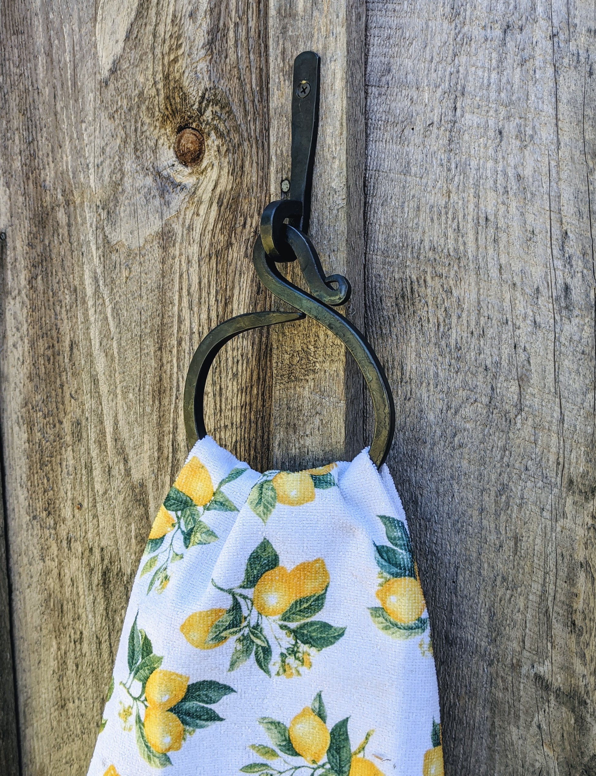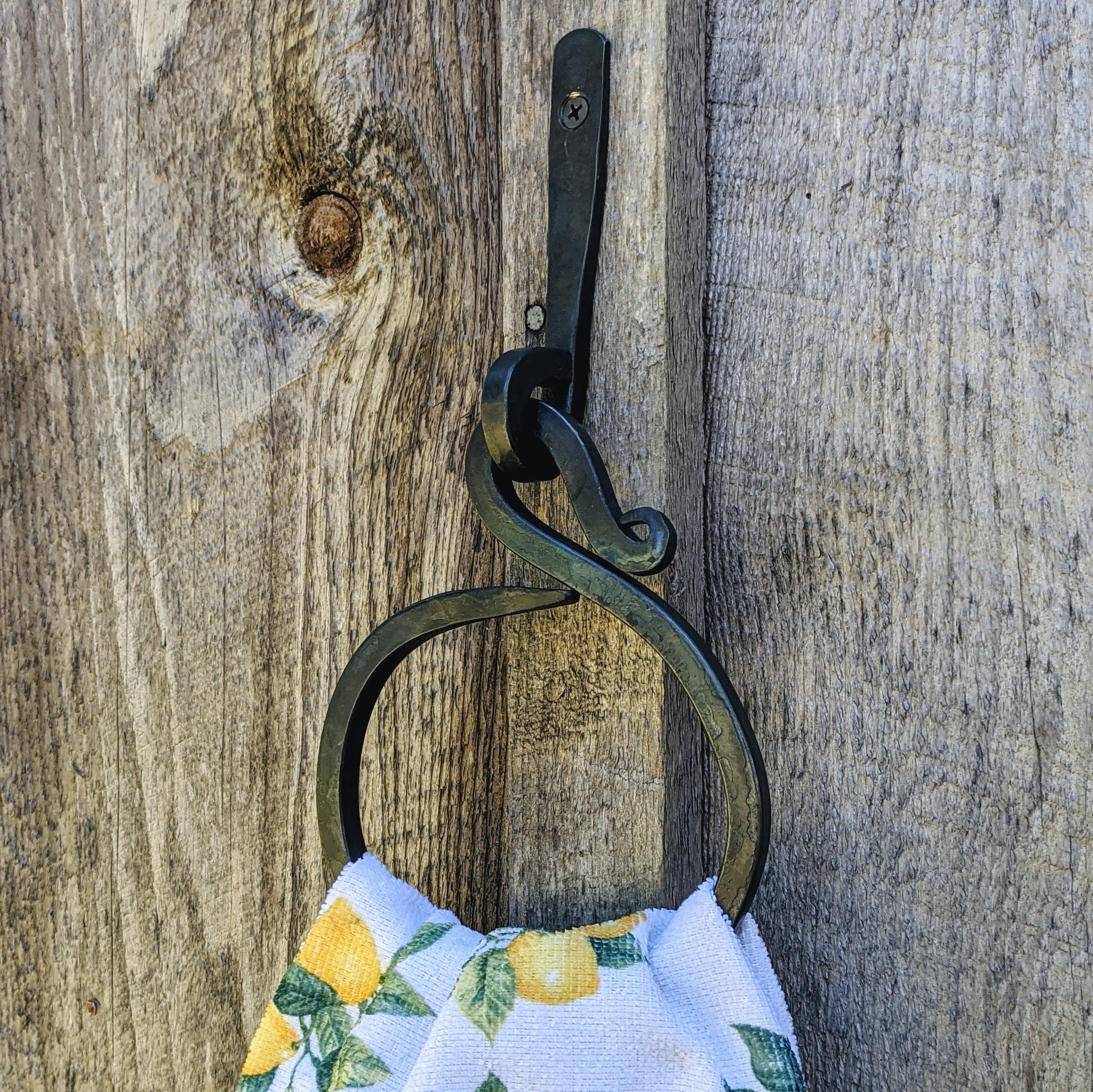Designed for hand towels, this hand forged holder would look lovely in any kitchen or bathroom. The circle is about 5" in diameter, not including the scroll at top. The piece that mounts to the wall is about 4.5" in height. The two pieces are joined by graceful curves in the steel, fashioned while hot in the forge. They will not come apart but will move to accommodate even the fluffiest towels! This piece is finished with beeswax, which will prevent rust. The pictures are an accurate representation, but you may not get the exact one pictured due to slight differences since they are hand made.