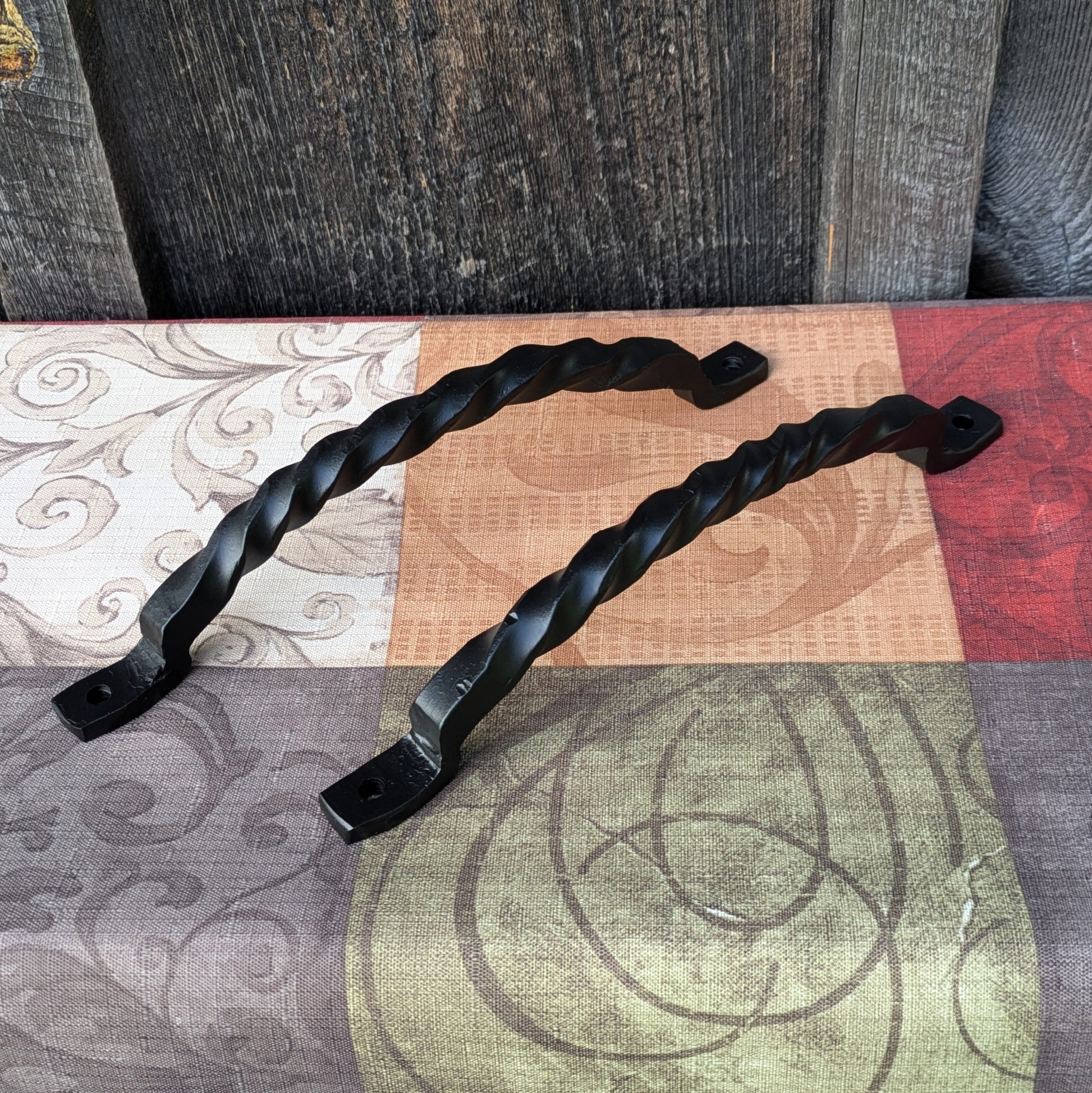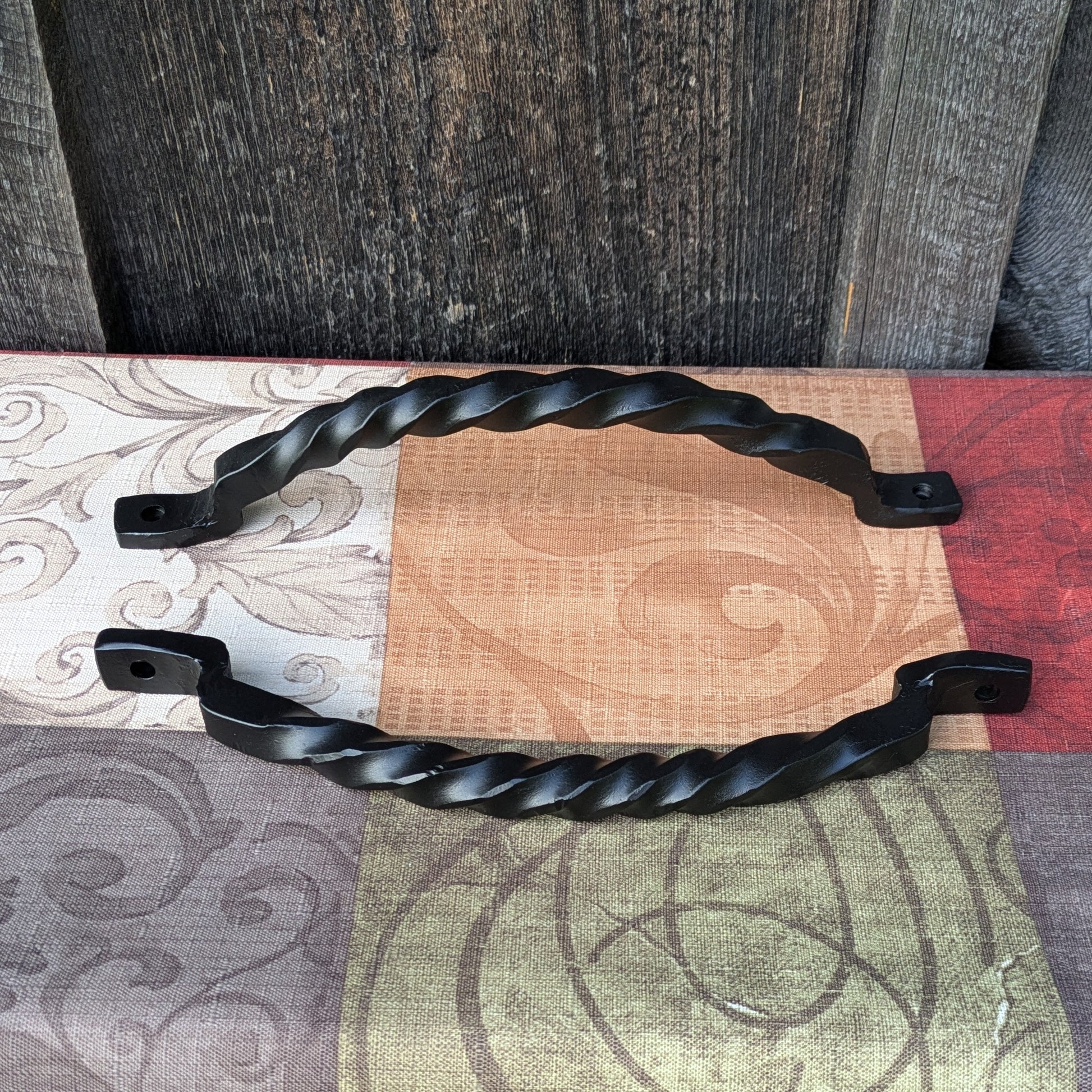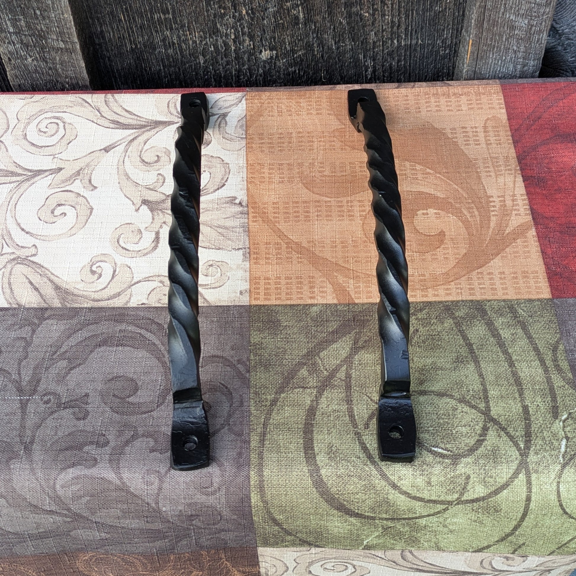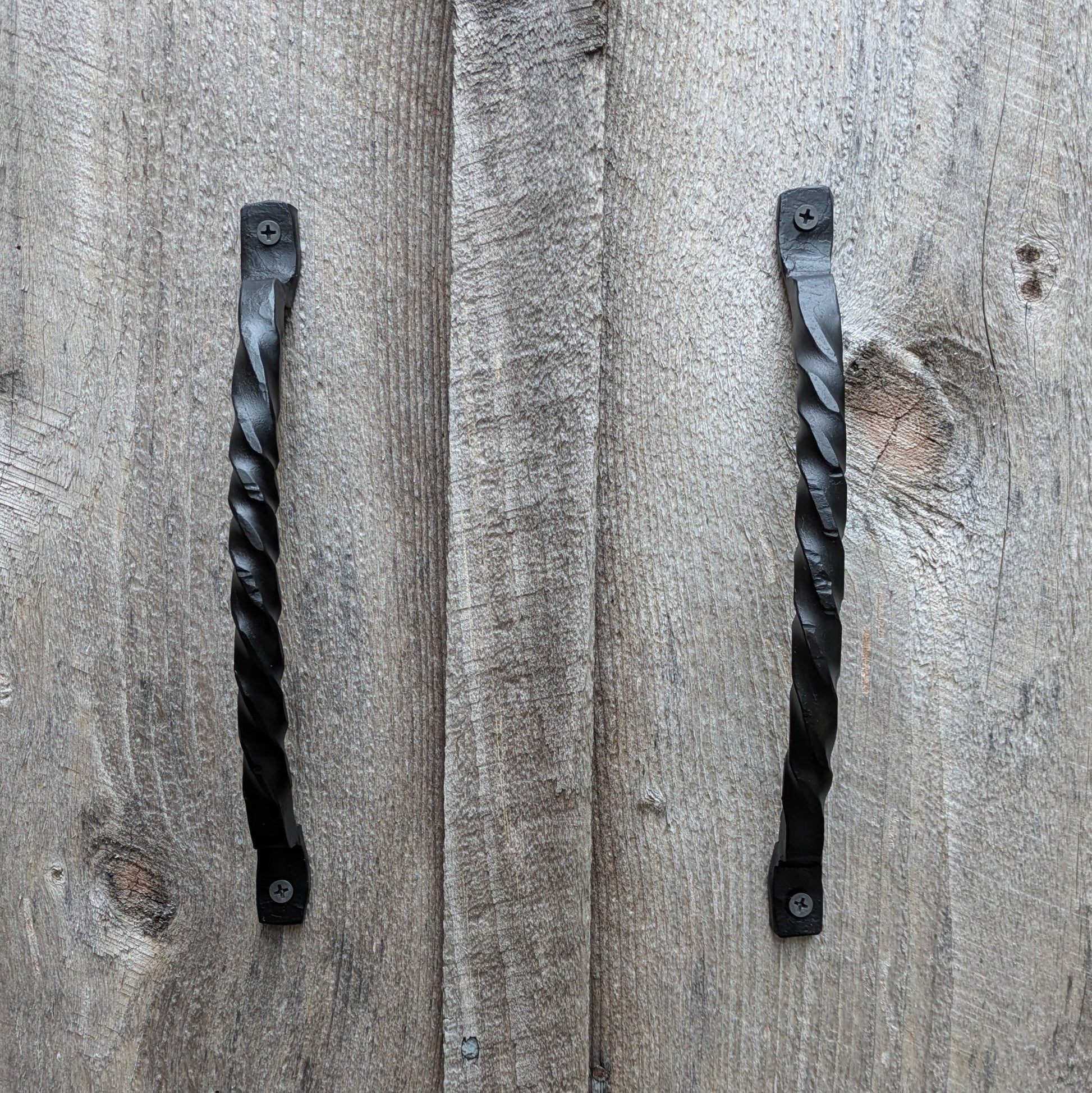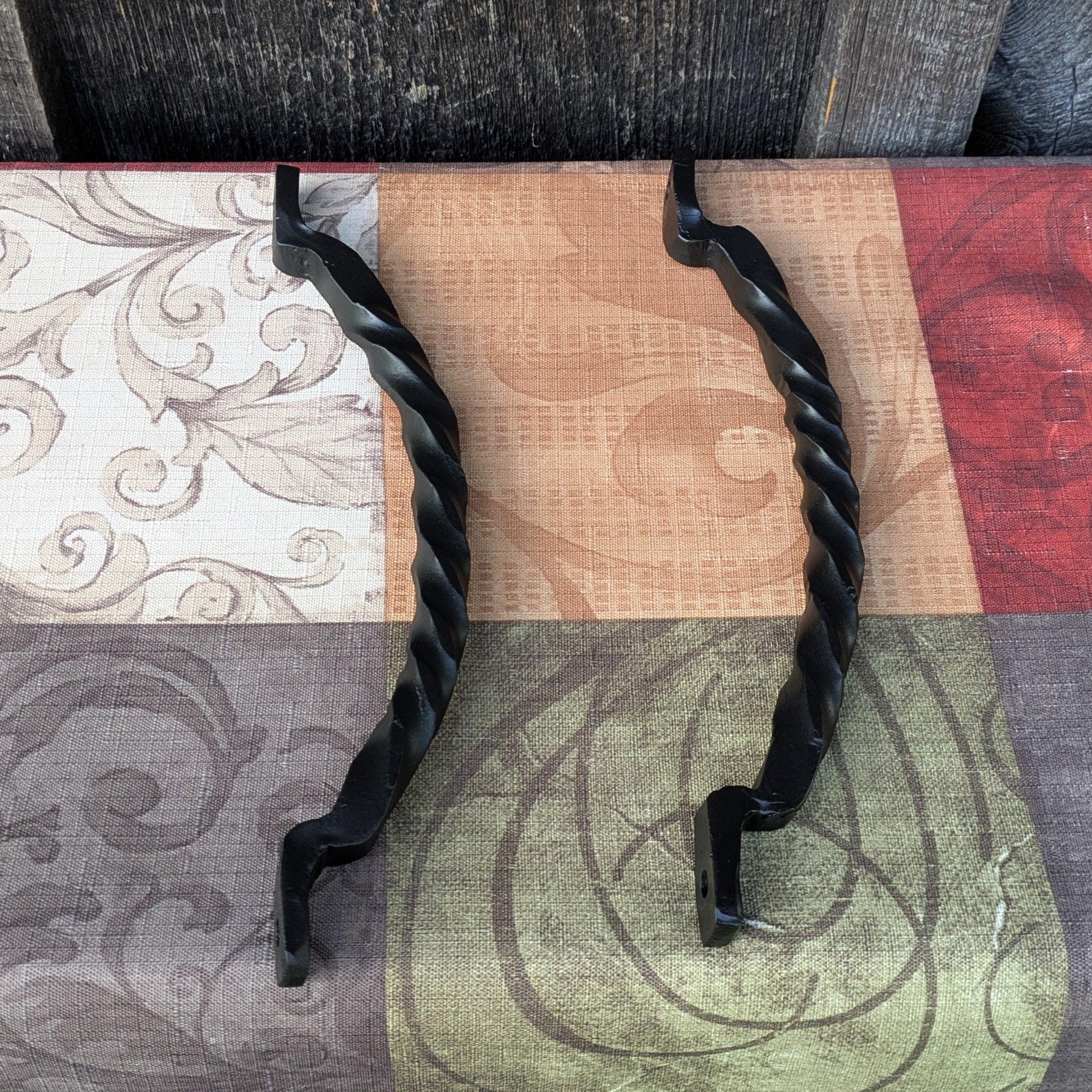 This listing is for a set of two handles made of a solid piece of 1/2" square stock steel which has been shaped into a handle with a twist running across the handhold. They measure about 10" in overall length and come away from the wall approximately 2". They are great for indoor or outdoor doors, or mount them horizontally to use for drawer or cabinet pulls or as safety handles for stairs or bathrooms. They are given a black painted finish and are suitable for indoor or outdoor use.