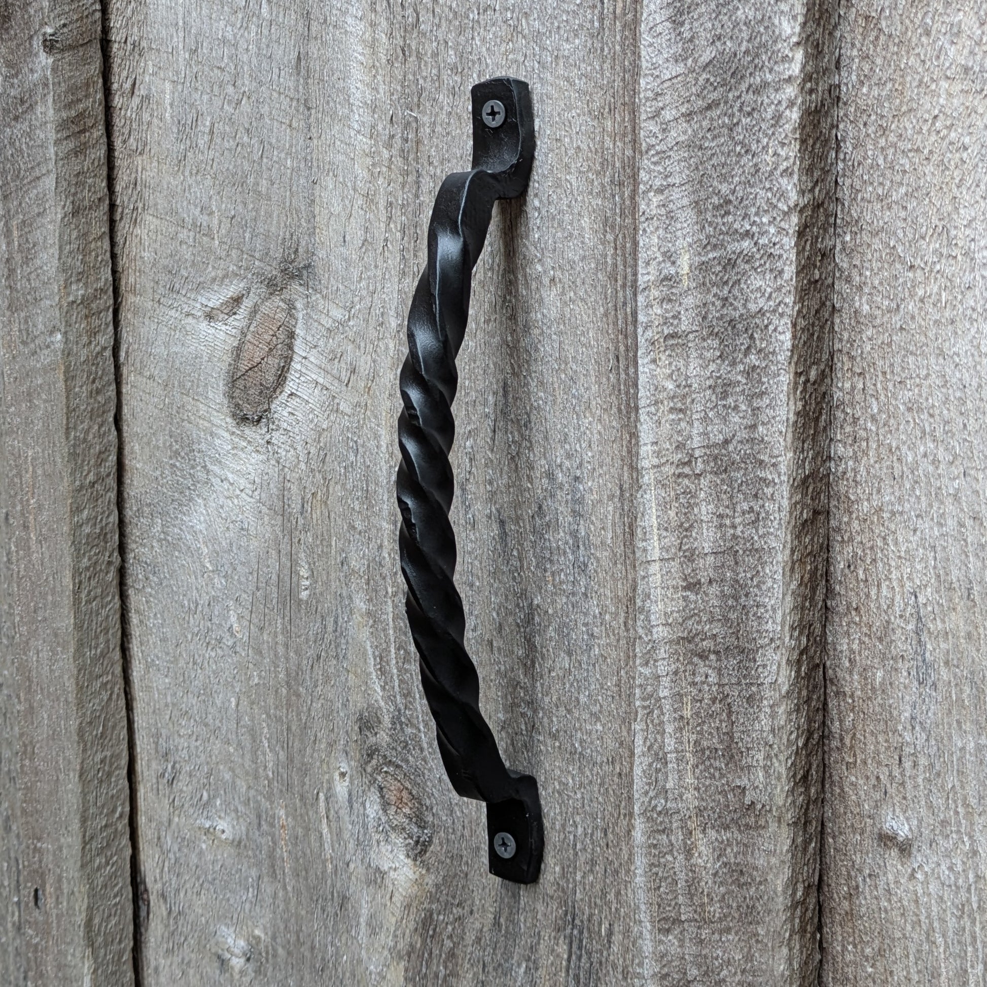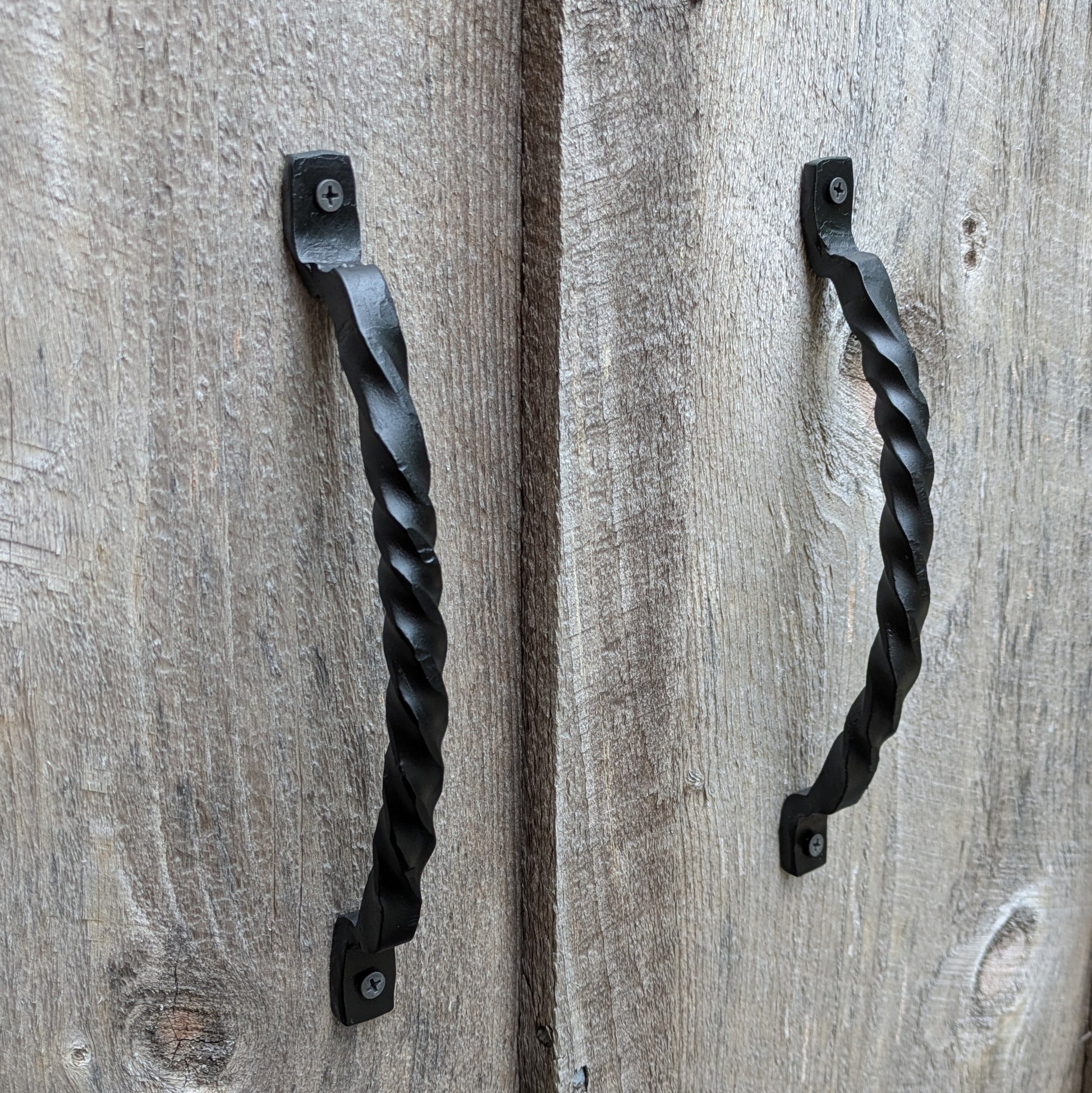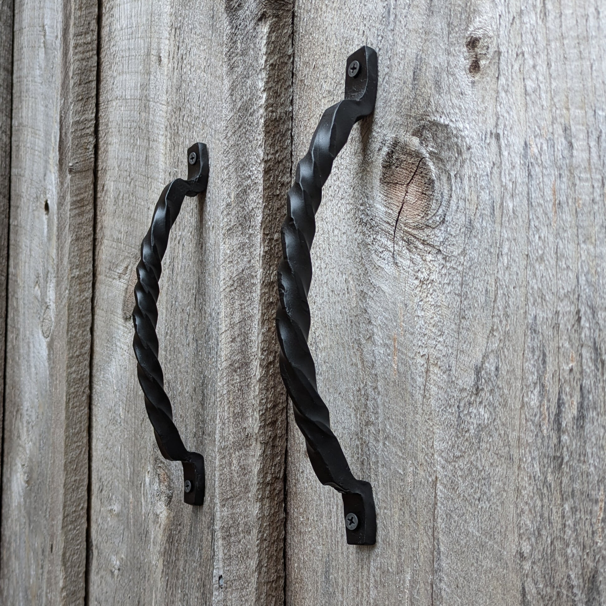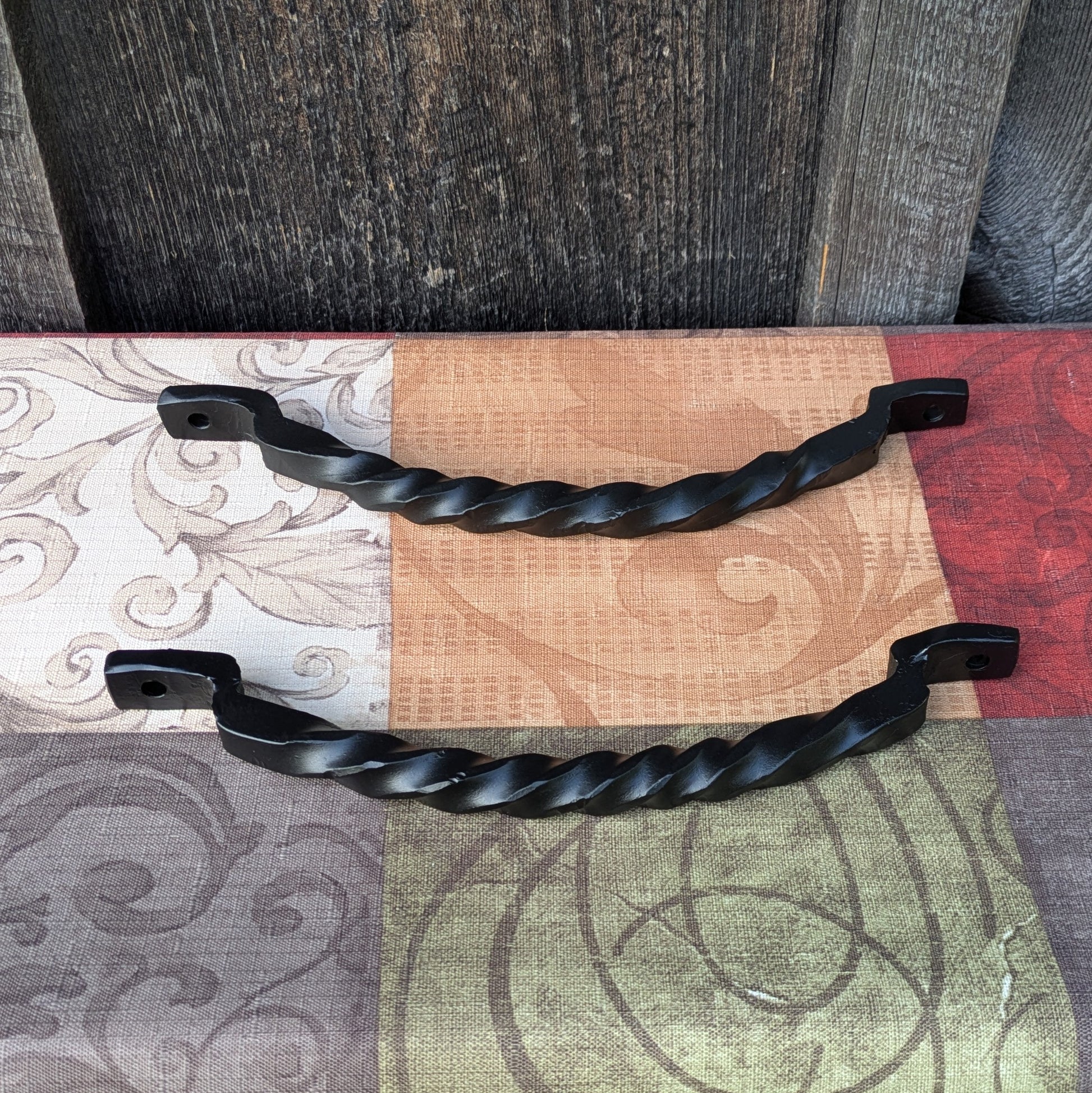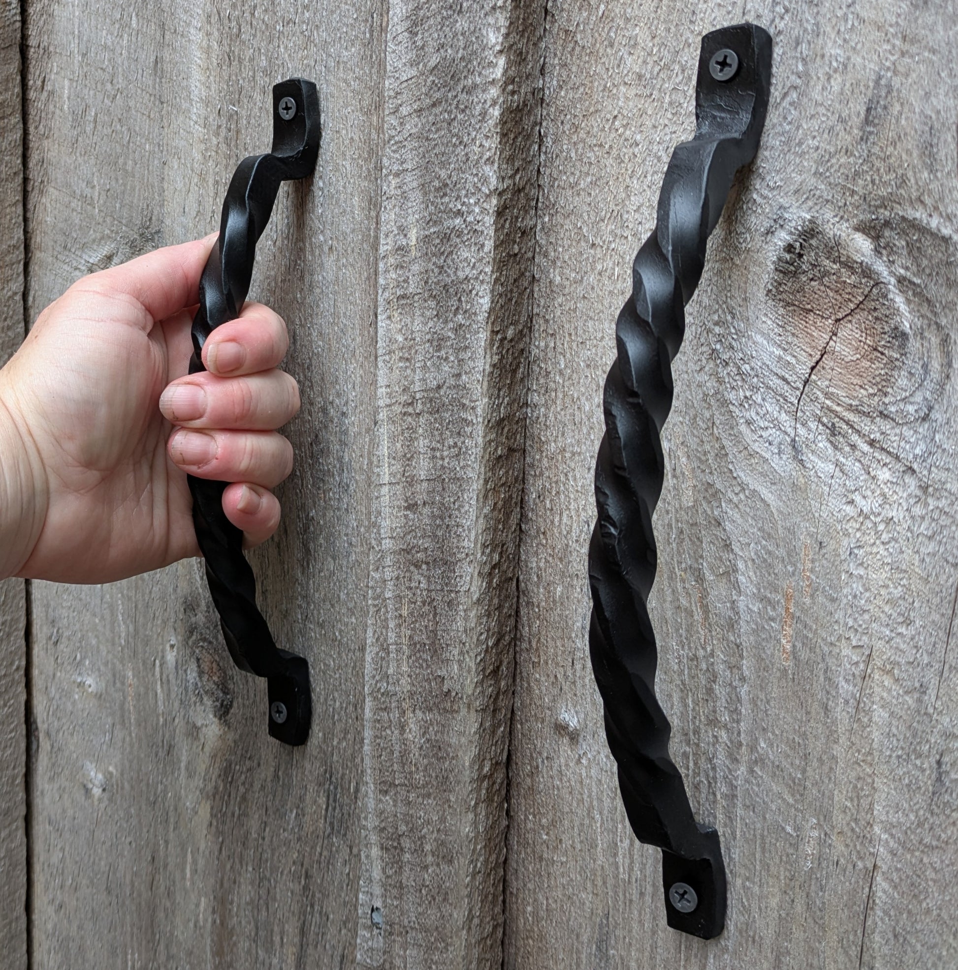 This listing is for a set of two handles made of a solid piece of 1/2" square stock steel which has been shaped into a handle with a twist running across the handhold. They measure about 10" in overall length and come away from the wall approximately 2". They are great for indoor or outdoor doors, or mount them horizontally to use for drawer or cabinet pulls or as safety handles for stairs or bathrooms. They are given a black painted finish and are suitable for indoor or outdoor use.