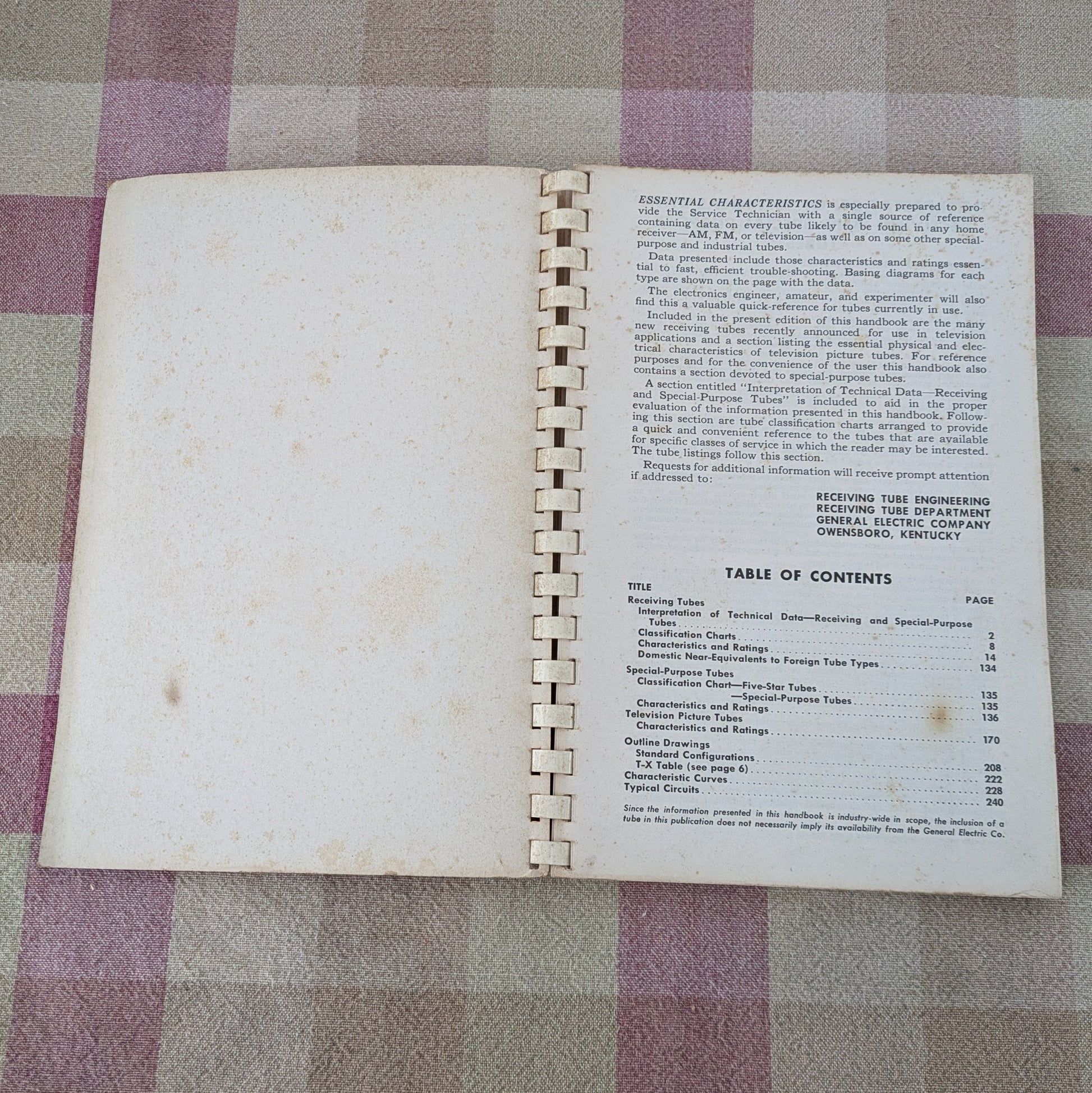 Vintage guide from General Electric, designed to help service technicians look up tubes for AM and FM radios, televisions, and also includes select special purpose and industrial tubes. It gives ratings, electrical information and diagrams on a wide variety of tubes plus drawings with dimensions of the various shapes. Also includes some graphs, circuit diagrams and more. 260 pages, spiral bound. A helpful reference for anyone trying to work on vintage electronics!