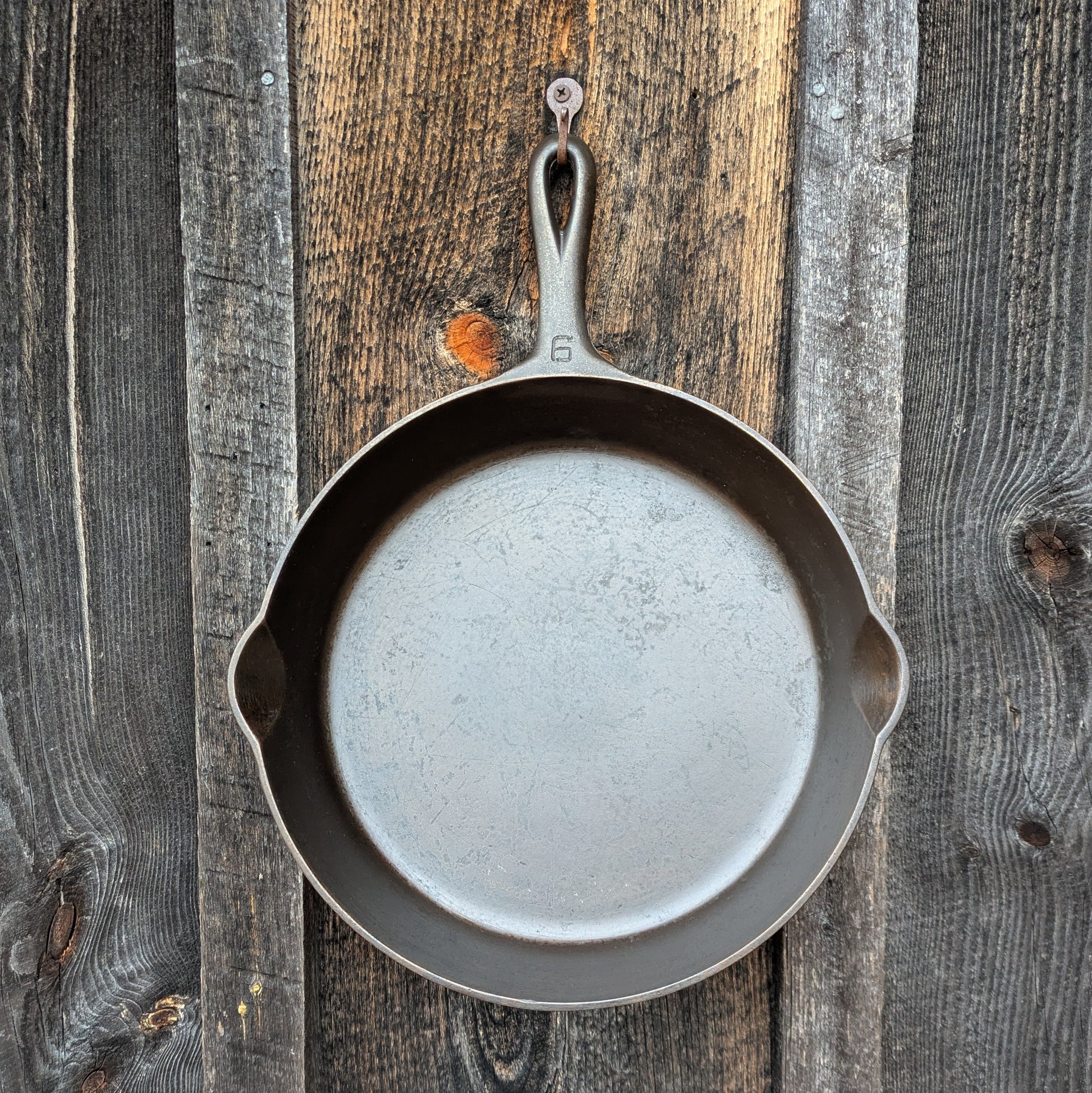 Estate find, please review all photos for more information on condition. No cracks or chips. Has a 1-2 card wobble if pressed, no spin. Not recommended for glass top stoves. The cooking surface has some utensil marks and flea bites on the cooking surface but overall this skillet is ready to cook many more delicious meals.