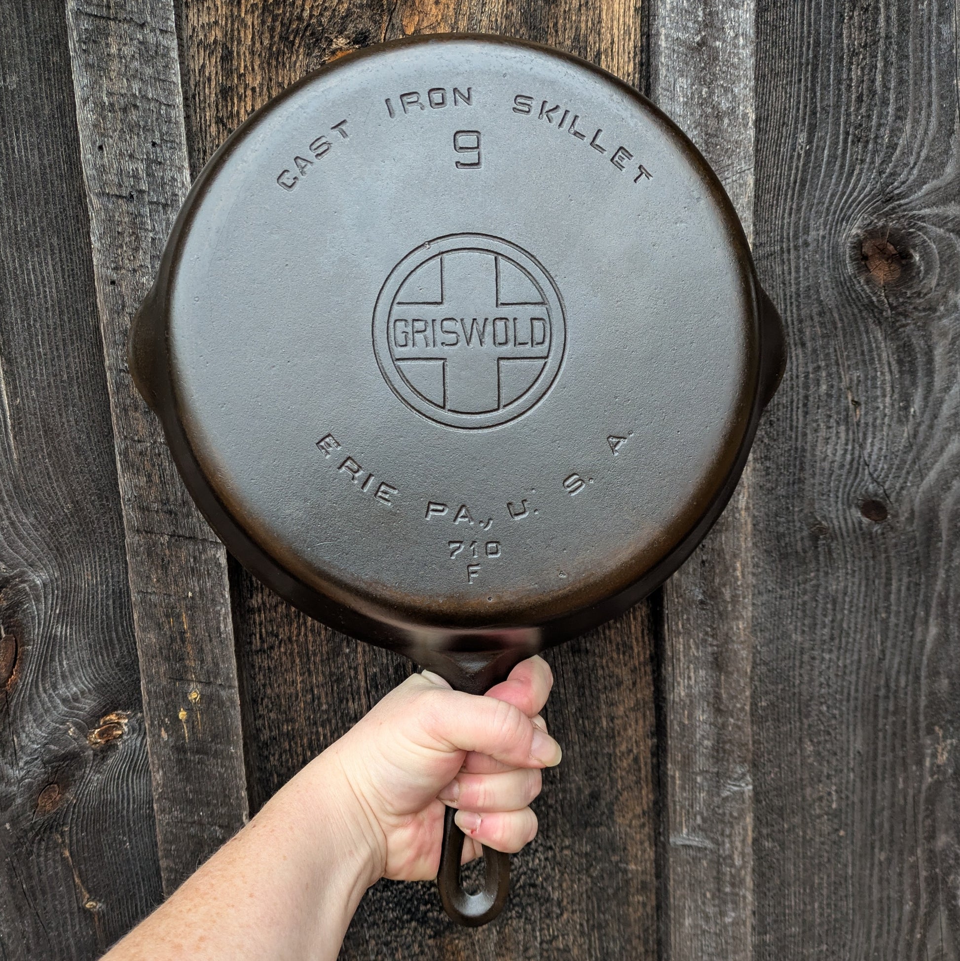 Vintage Griswold 9 skillet with large block logo, smooth bottom, and marked Erie PA USA. Made between 1930-1939 in Erie Pennsylvania, only about 60 miles from our farm. Fully restored and seasoned so it is ready for use or display. Measures 16.25" long including handle, 11.5" across and 2" deep. This skillet had a catalog number of 710 F. #9 skillets are large enough to cook a meal for the whole family!
