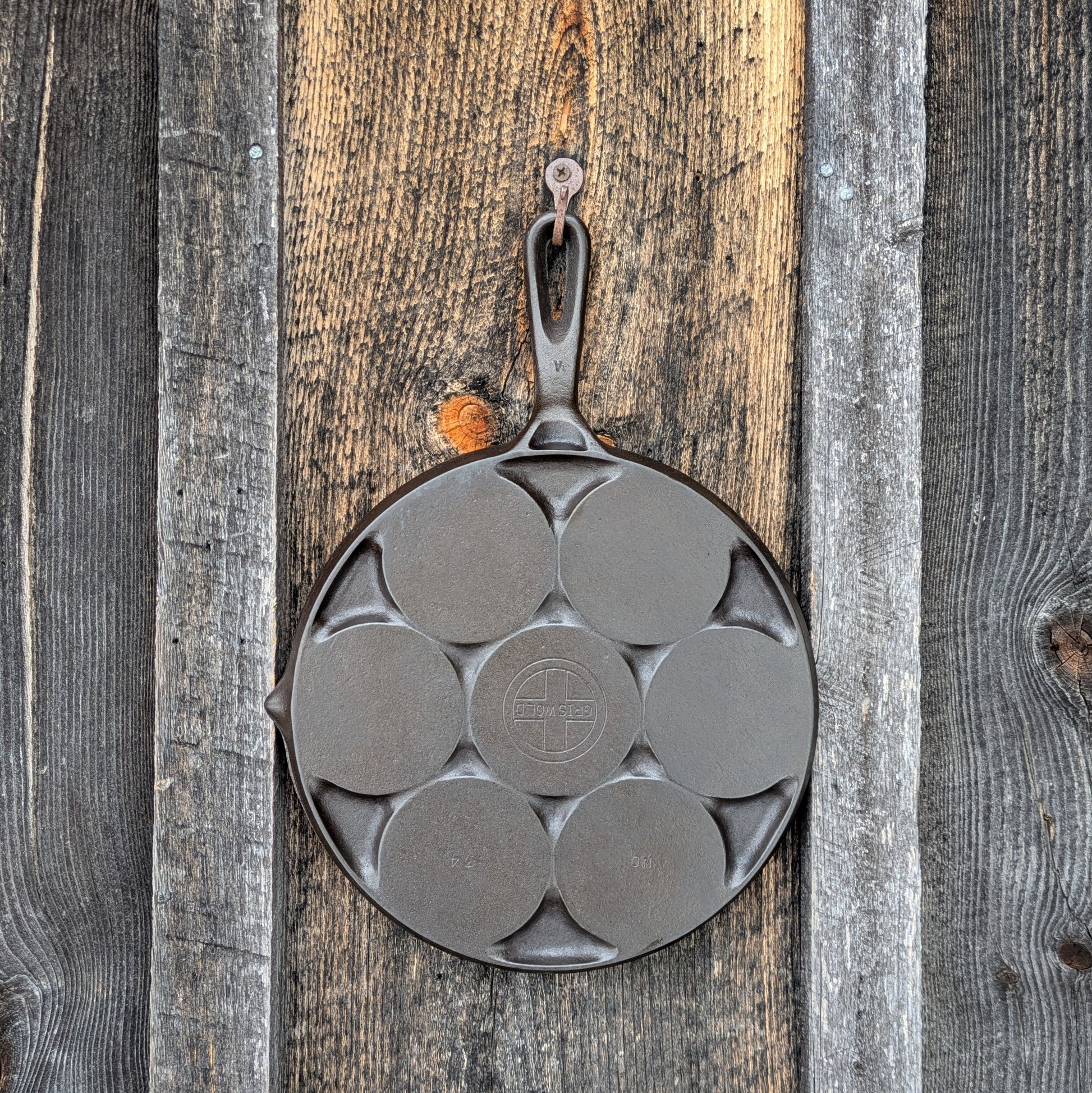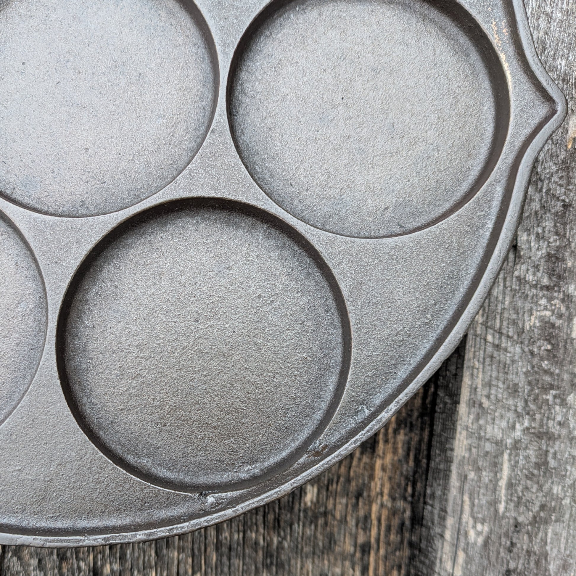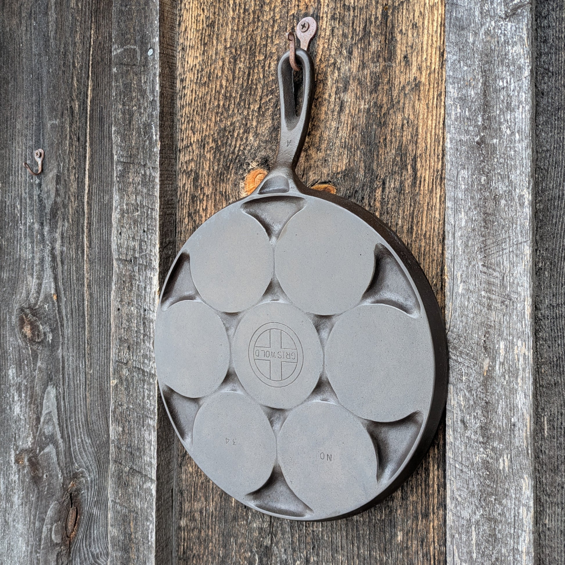 Nice vintage Griswold plett pan. Marked Griswold, No. 34, made in the 1960's-1970's after the Erie, PA foundry closed. Measures 9.5" across, 14" including handle. There are7 cups, each measures 3" across and .25" deep.