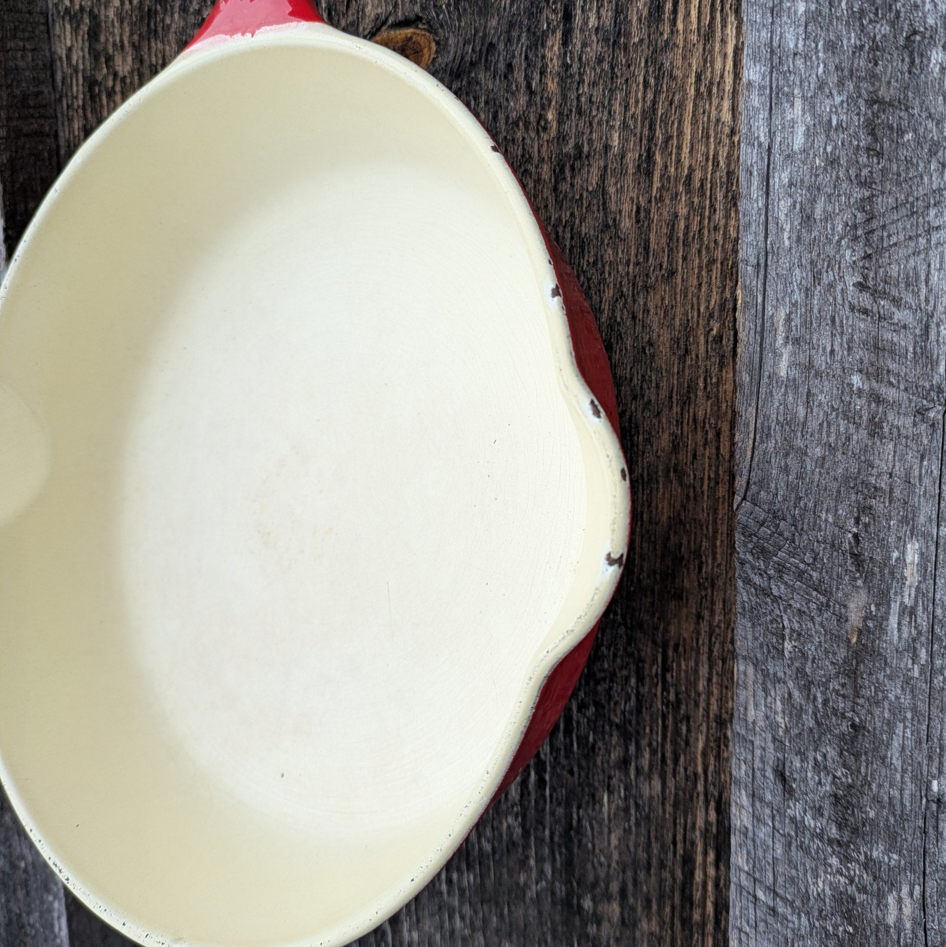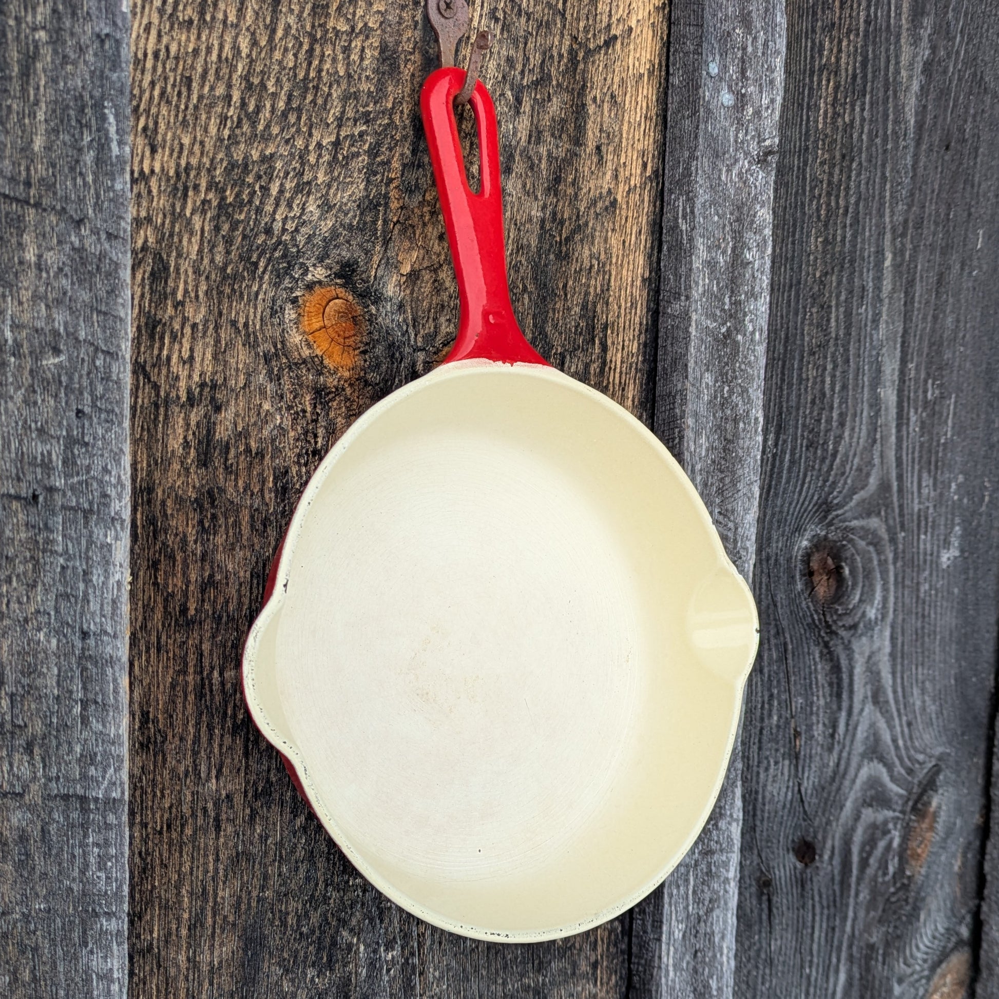 Enameled cast iron skillet, size #5, made by Griswold in Erie, PA, sometime in the 1950's. It measures 8" across, 12.5" long including handle, and is 2" deep. It is enameled in flamingo red on the exterior and cream enamel on the cooking surface. Catalog number is 724.