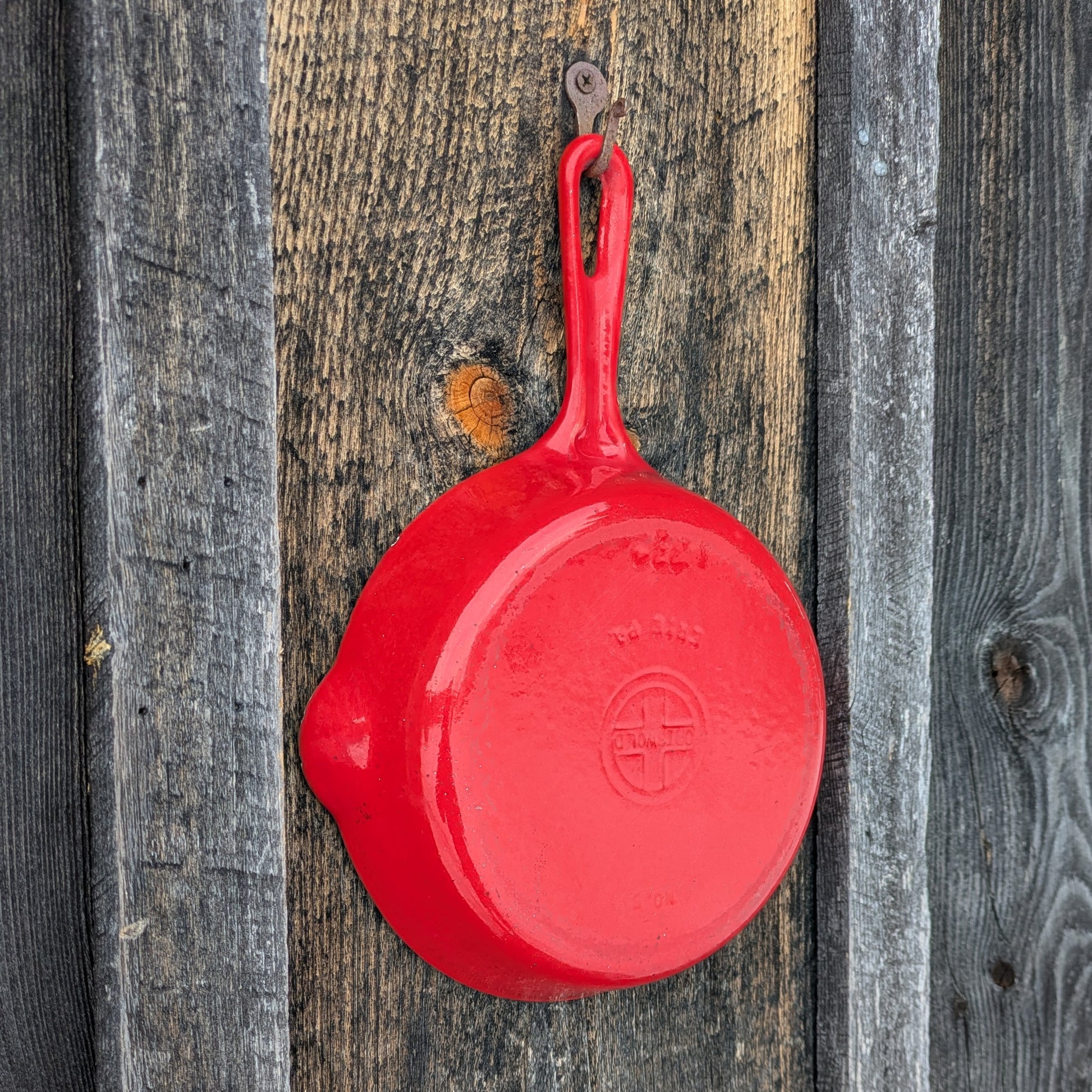 Griswold Flamingo Red and Cream Enamel #5 Cast Iron Skillet with Small Block Logo 724