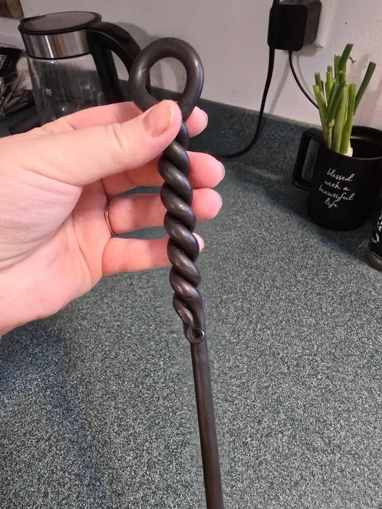 Listing is for a hand forged steak turner to help grill your favorite meats and veggies. It can also be used as a small fire poker. It measures approximately 17" overall and has a convenient loop at the end to hang when not in use. End comes to a point as shown, but is not sharpened. Made of one continuous piece of solid steel so you can be sure it will last. This piece is finished with beeswax, which is food safe and will prevent rust. Choose from left or right handed.