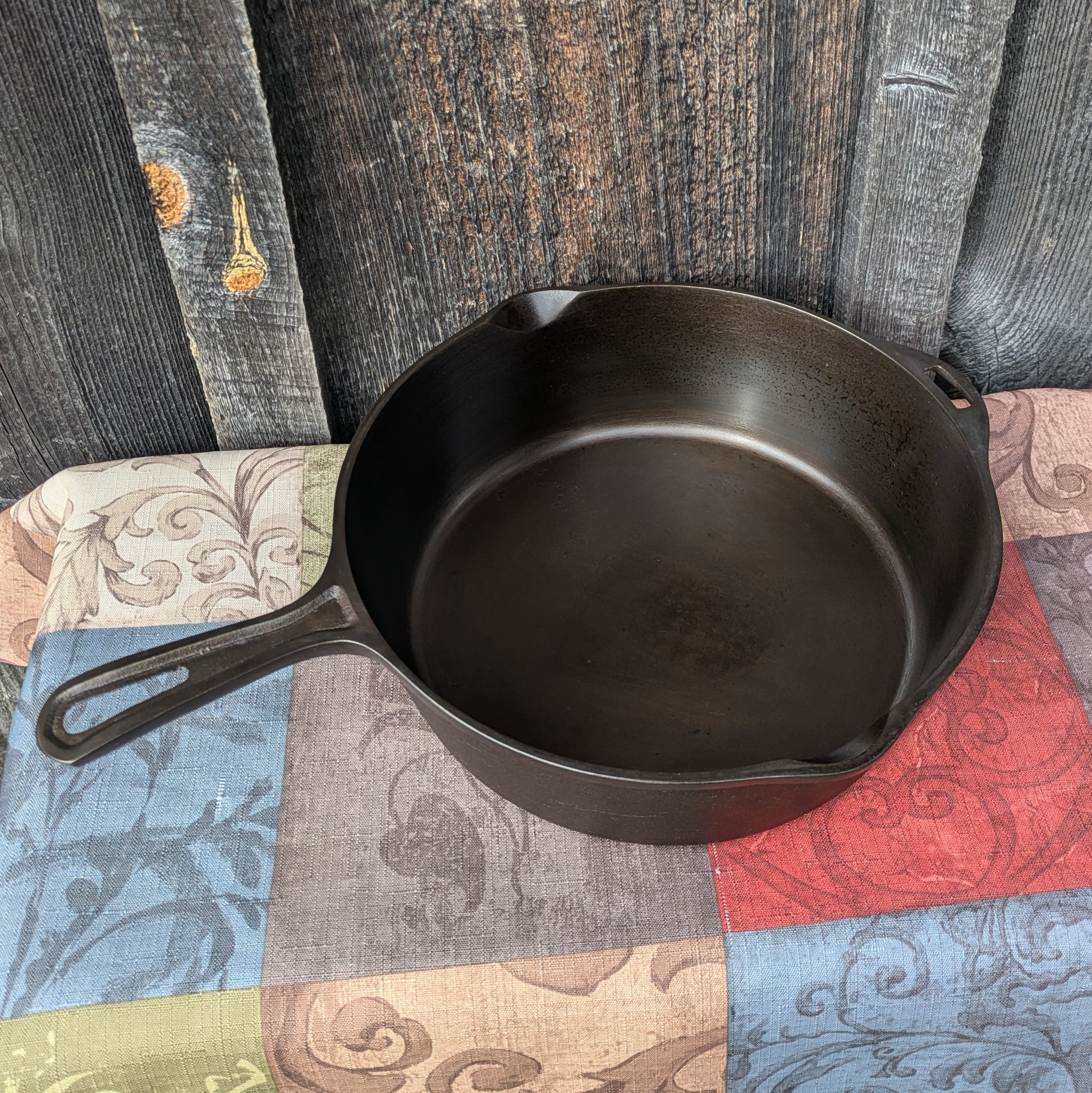 Vintage estate find, please review photos. No chips or cracks. In very nice condition other than a few light spots of rust damage to the cooking surfaces as shown. These should season in completely with use. Both pieces have a wobble/spin and are not recommended for glass top stoves. Professionally restored via electrolysis and given multiple coats of grapeseed oil seasoning. Ready for use or display.