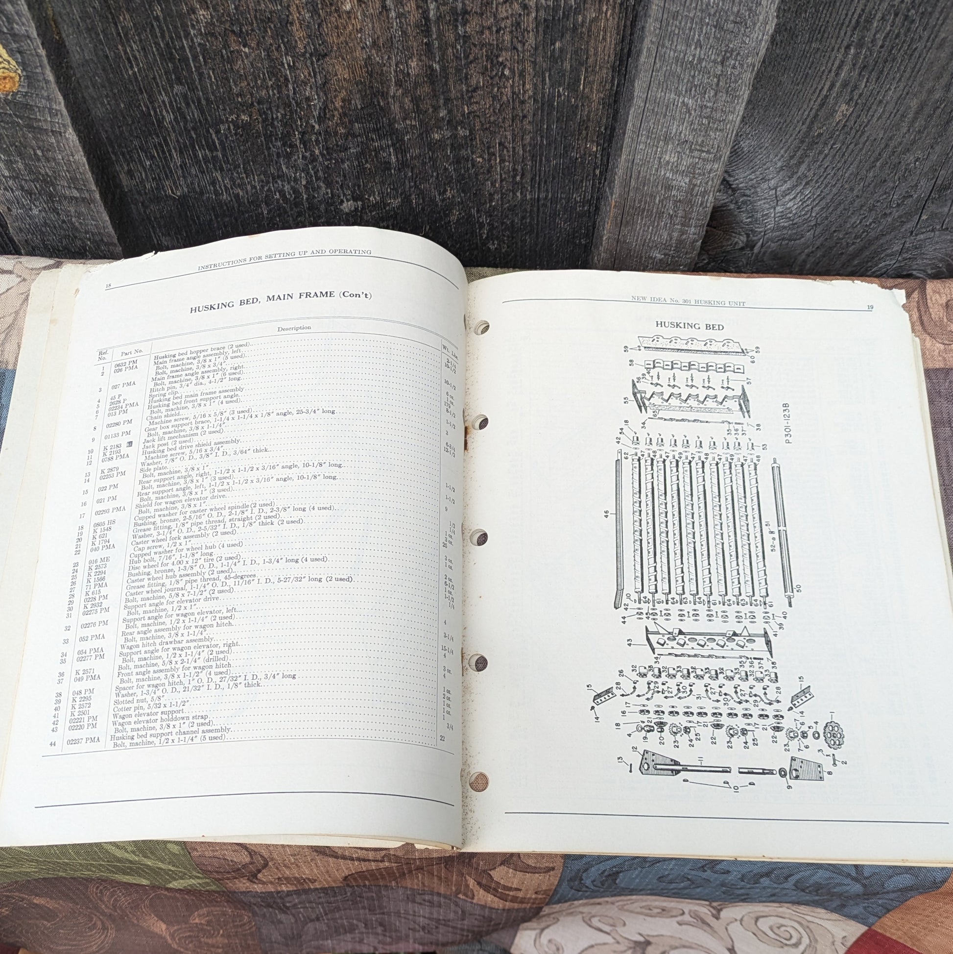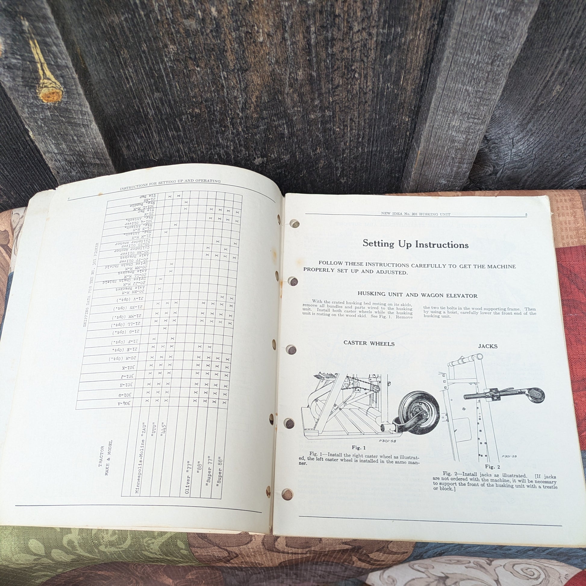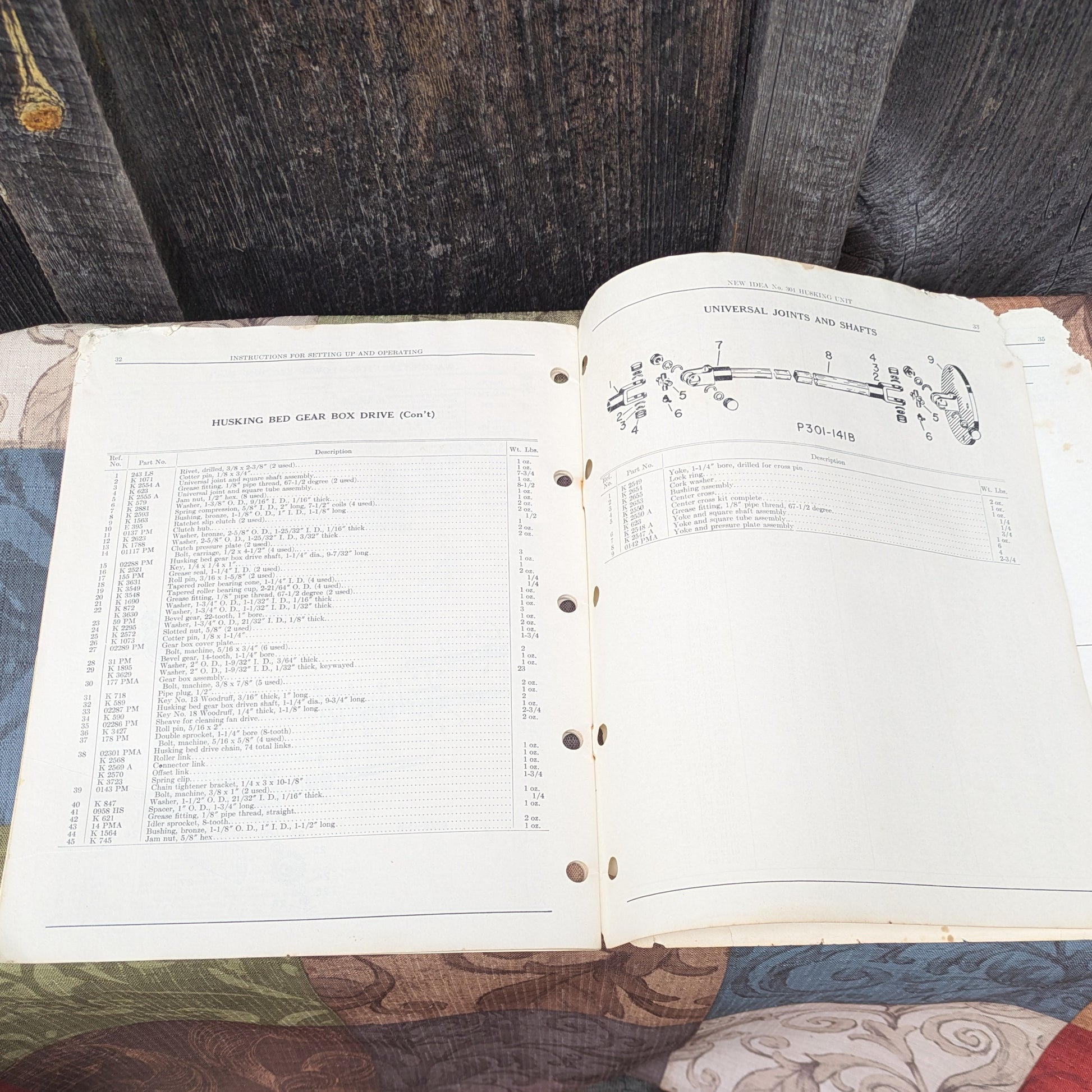 Vintage manual for the #301 New Idea Husking Unit. Has instructions for "the dealer and the operator", including setup, maintenance and troubleshooting. Full of black and white diagrams, many with accompanying parts lists. 32 pages.