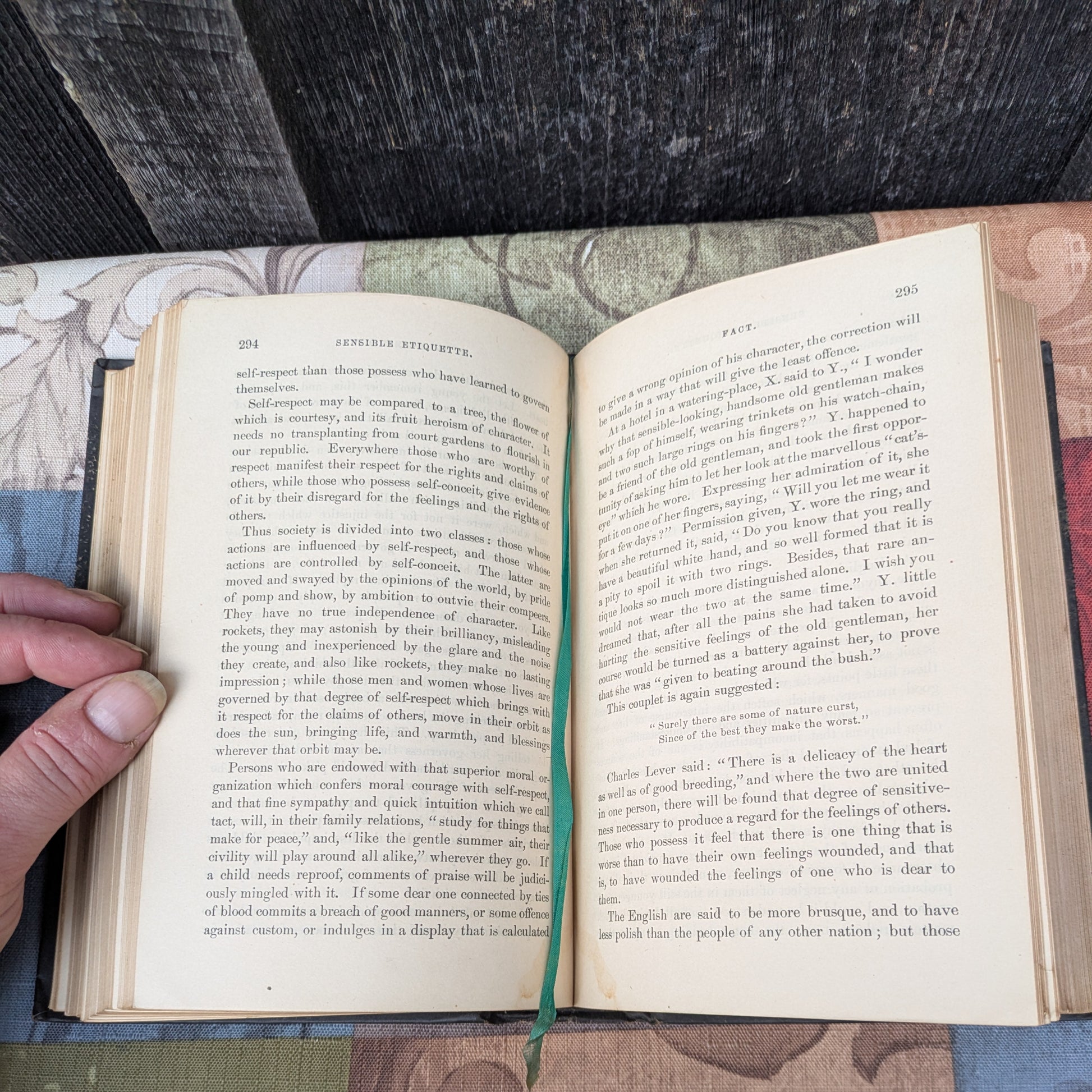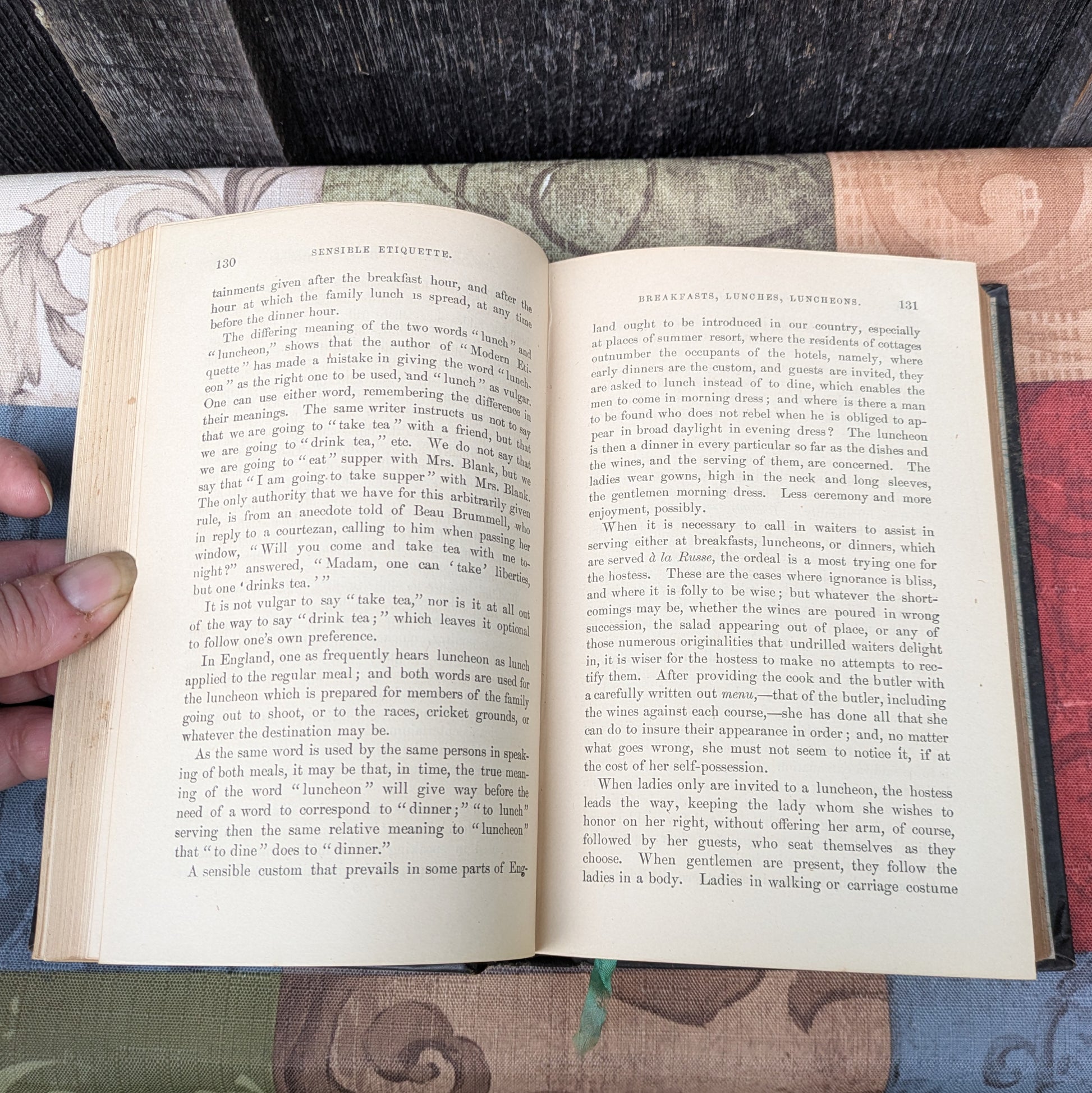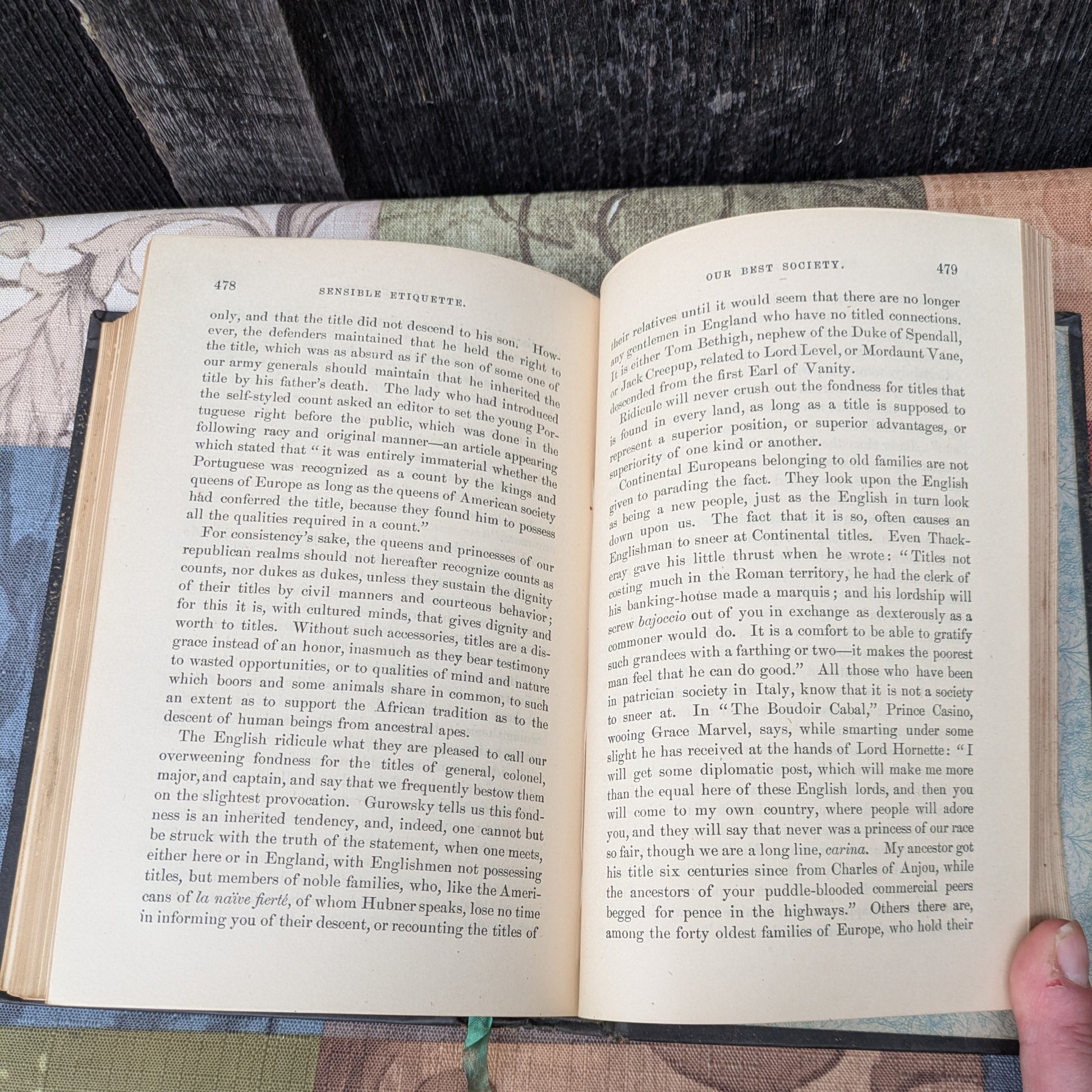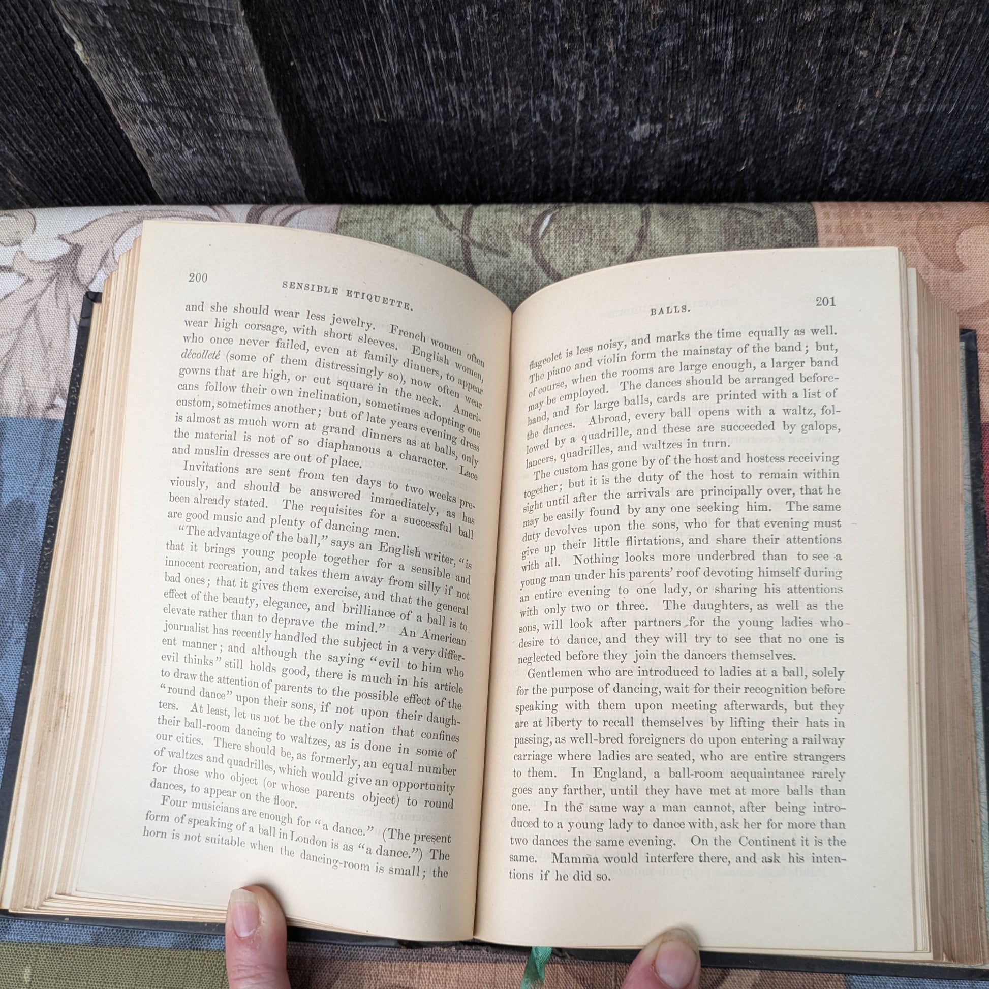 Written in 1878, Sensible Etiquette of the Best Society: Customs, Manners, Morals and Home Culture, complied from the best authorities by Mrs. H. O. Ward. Published in Philadelphia by Porter & Coates, this copy is the eighteenth revised edition. 567 pages including appendix.