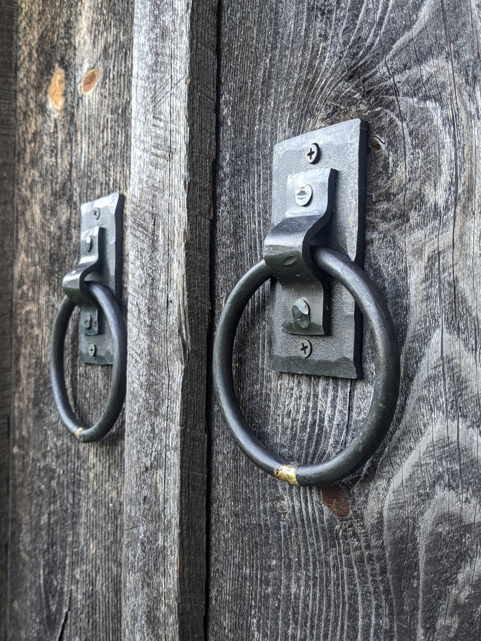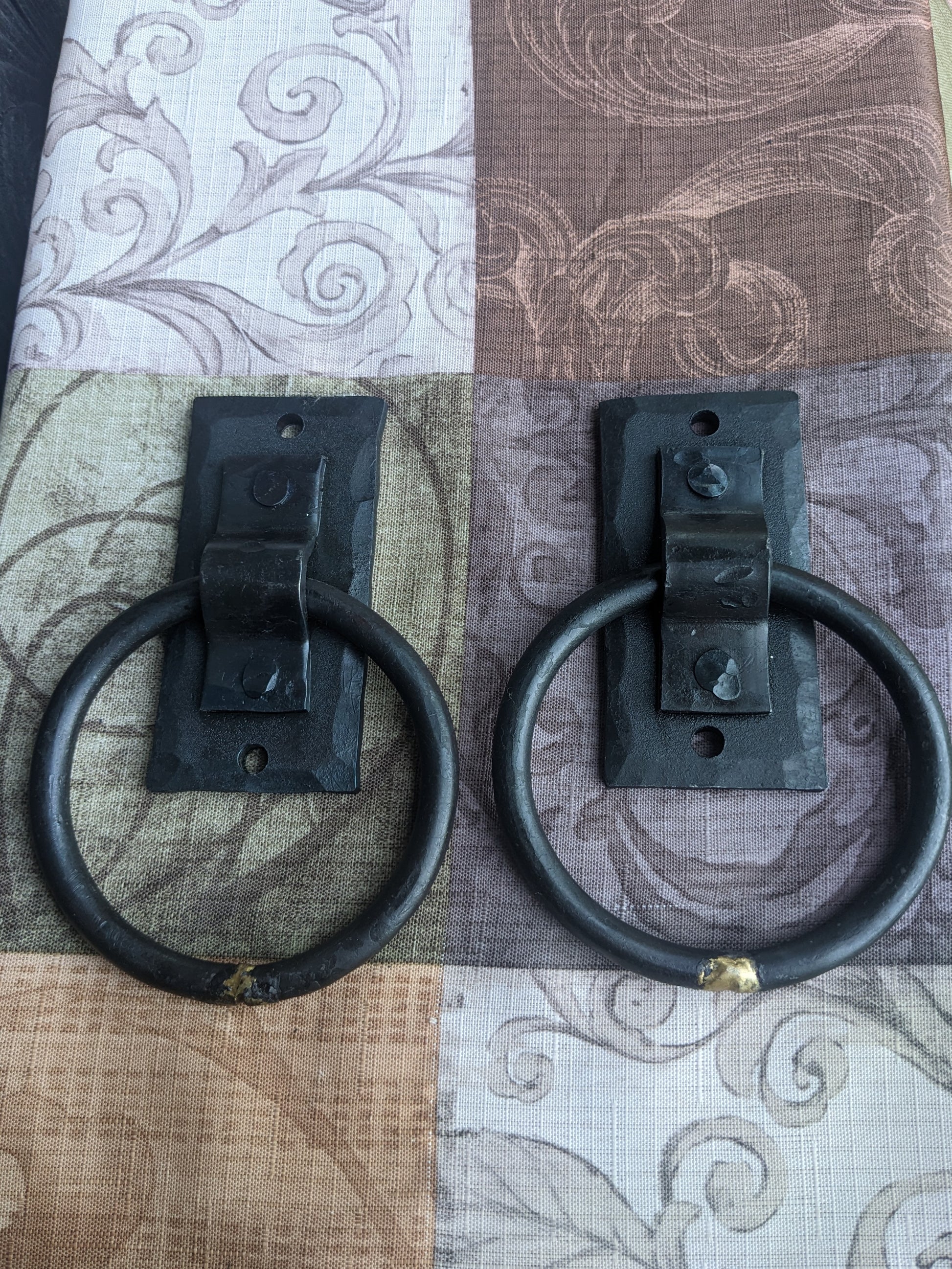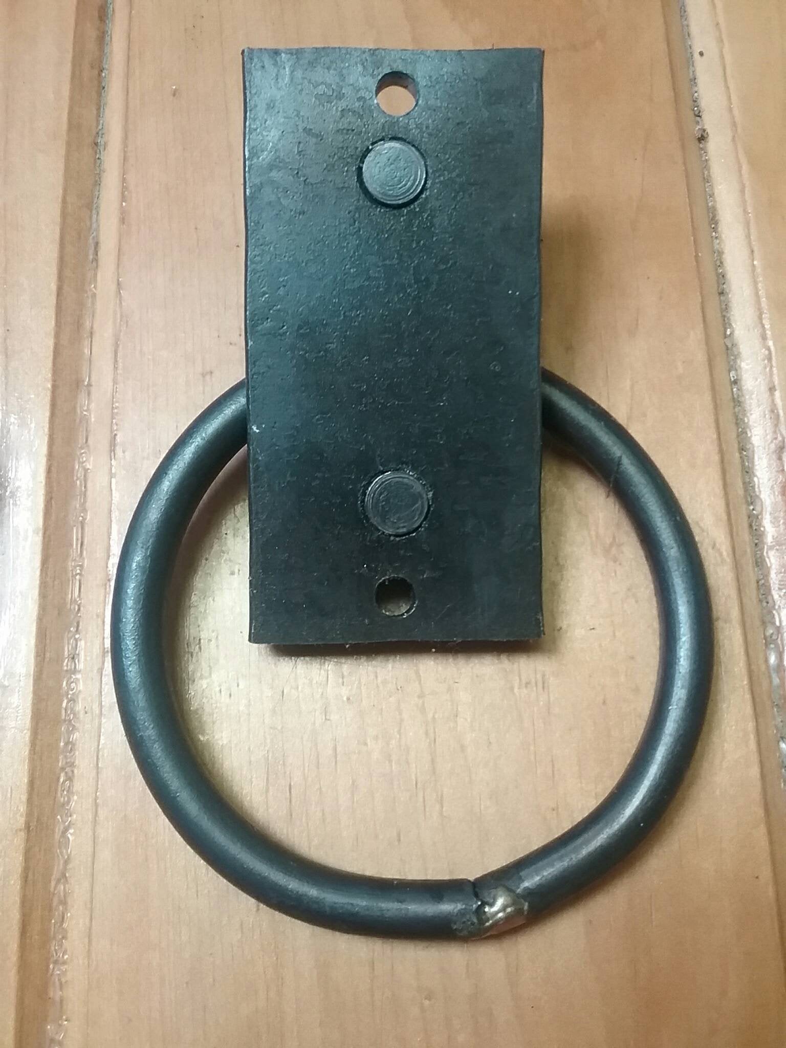 This listing is for a set of 2 handles made in the forge here at our family farm. They are made of a solid piece of 5/16" round stock steel which has been shaped into a 4" ring. The ring is fitted into the mounting plate which is made of two pieces of steel riveted together using recessed rivets. Plate measures 4" high x 2" wide. The ring is able to move freely. Comes away from the wall/door/etc about 1 1/4". Please note sizes are approximate and will vary slightly as each piece is a handmade original. Feel free to contact us about a custom order if you need them to be a different size. We also offer a smaller version with 2.5" rings. These are given an oil finish to inhibit rust. Click here to learn more about oil finished products.