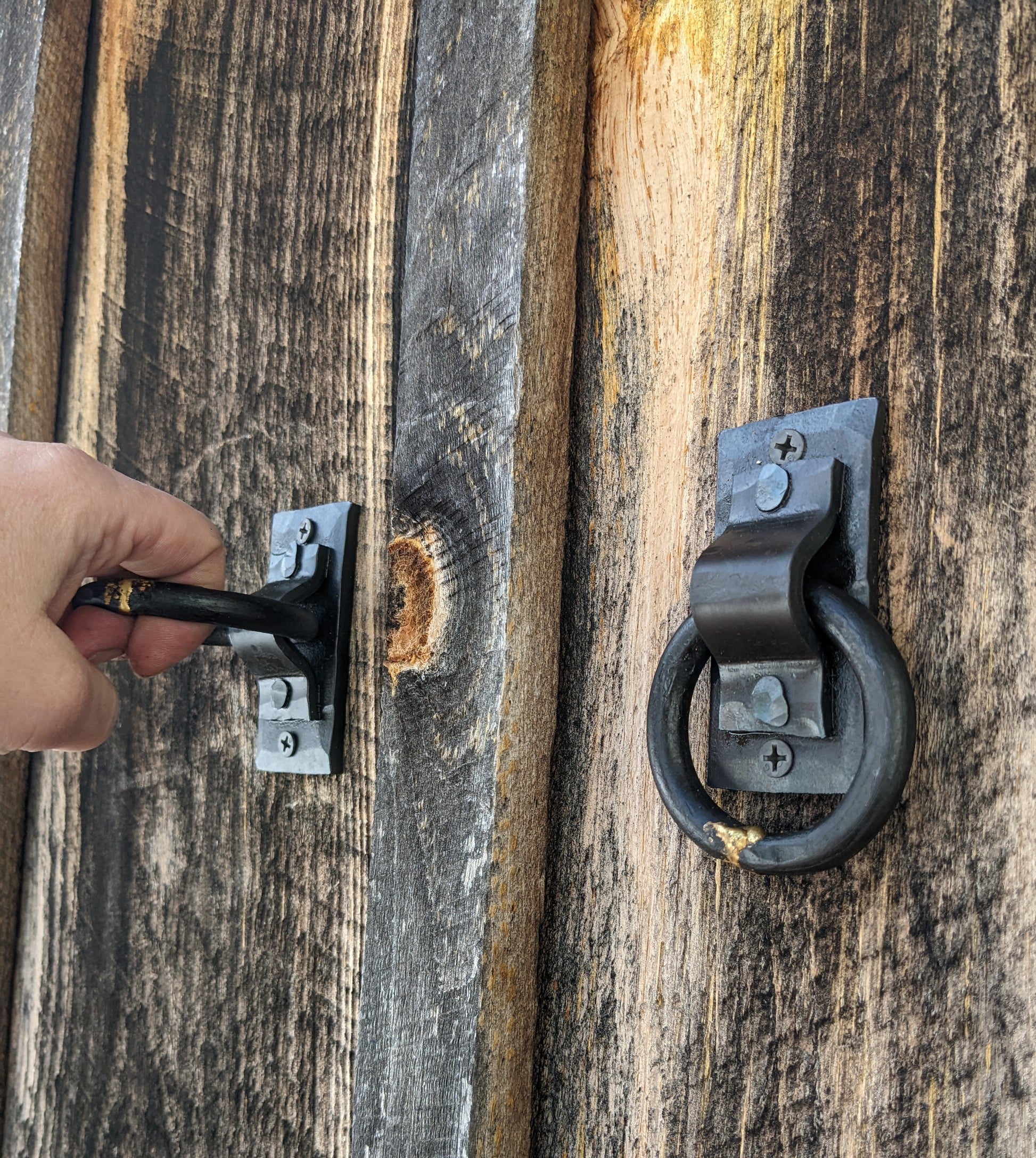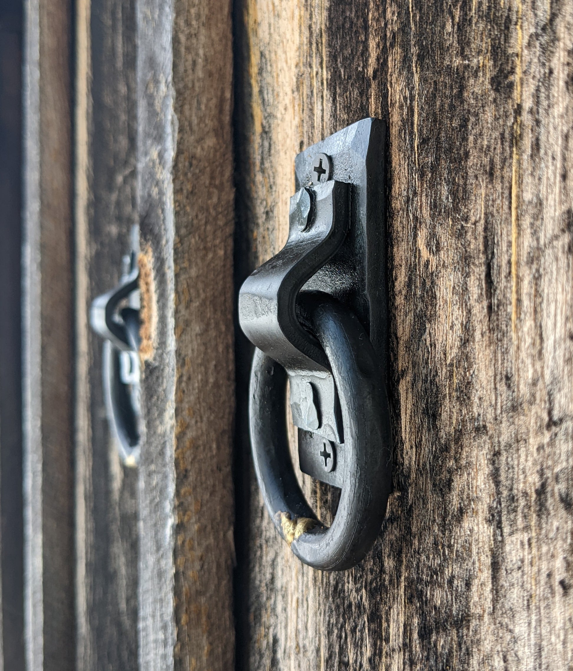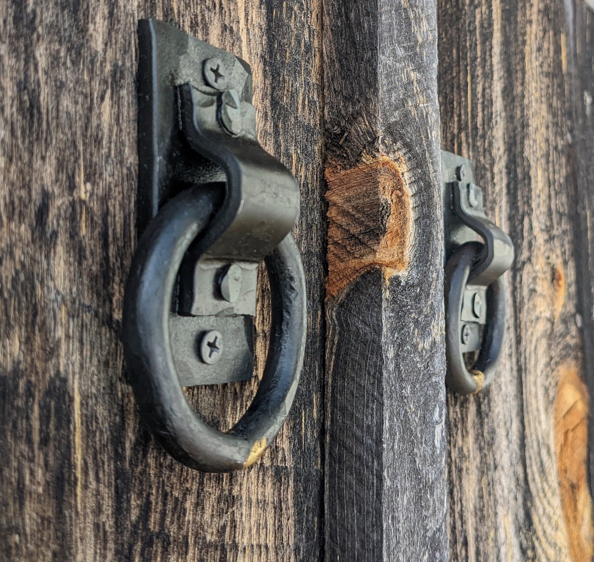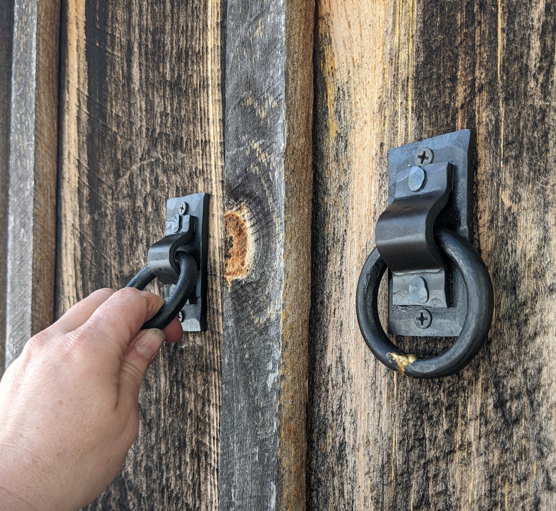 This listing is for a set of 2 handles made in the forge here at our family farm. They are made of a solid piece of 1/4" round stock steel which has been shaped into a 2 1/2" ring. The ring is fitted into the mounting plate which is made of two pieces of steel riveted together using recessed rivets. Plate measures 3" high x 1 1/2" wide. The ring is able to move freely. Comes away from the wall/door/etc about 1". Please note sizes are approximate and will vary slightly as each piece is a handmade original. Feel free to contact us about a custom order if you need them to be an exact size. It is given an oil finish to inhibit rust. The pictures are an accurate representation, but you may not get the exact one pictured due to slight differences since they are hand made. We generally make these up as they are ordered, we currently have a 2-week shipping estimate on all orders. We're also happy to do custom work, the handle can be made in different sizes in this style upon request. All our hand-forged metal work is made with a coal fire, anvil, hammers & other hand tools, just as a blacksmith would have used years ago. American-made quality designed to last a lifetime and beyond! We have a listing for this style of handle as a single rather than a pair, plus other styles and sizes of handles and more hand forged metal work for sale here.