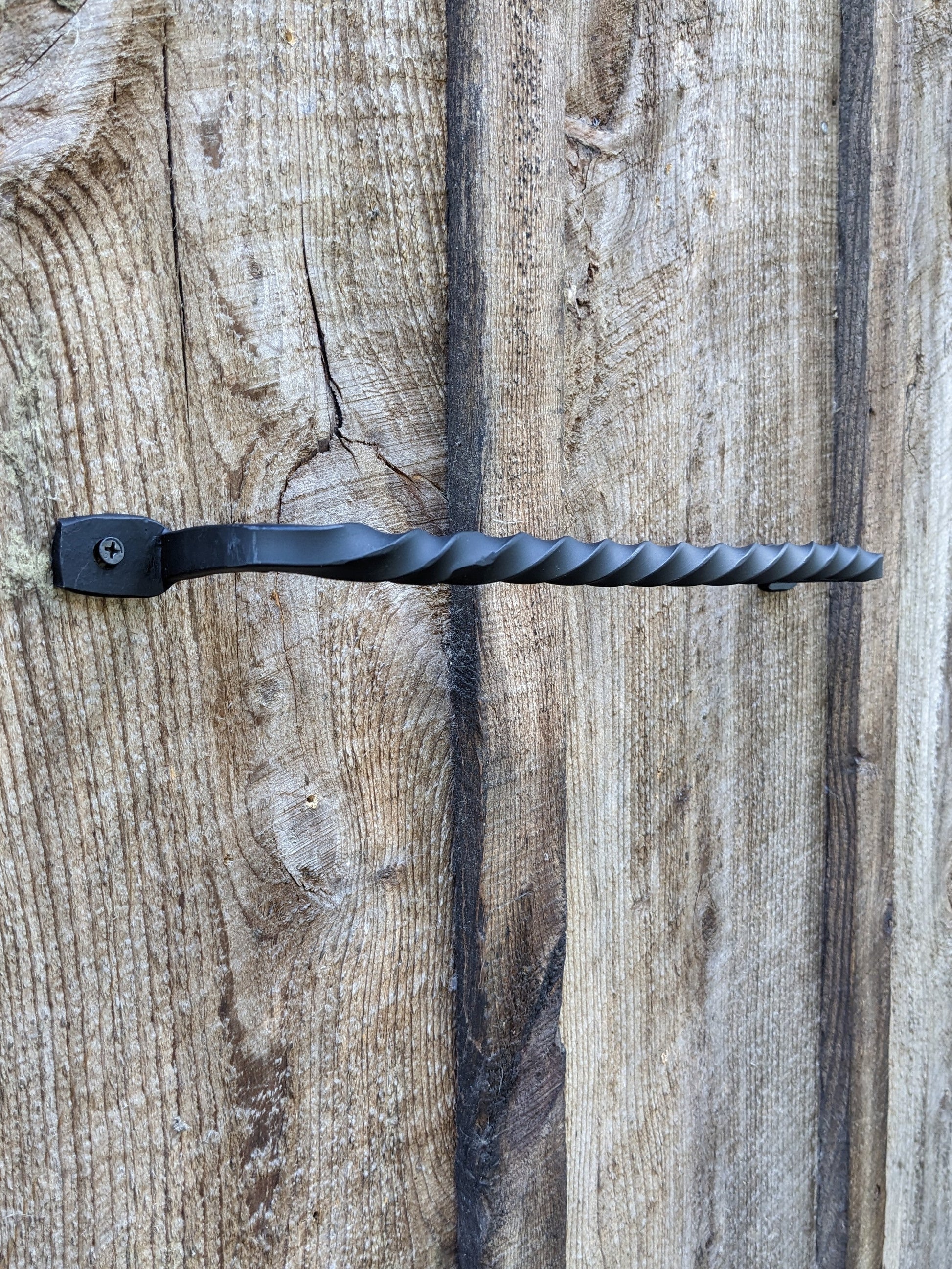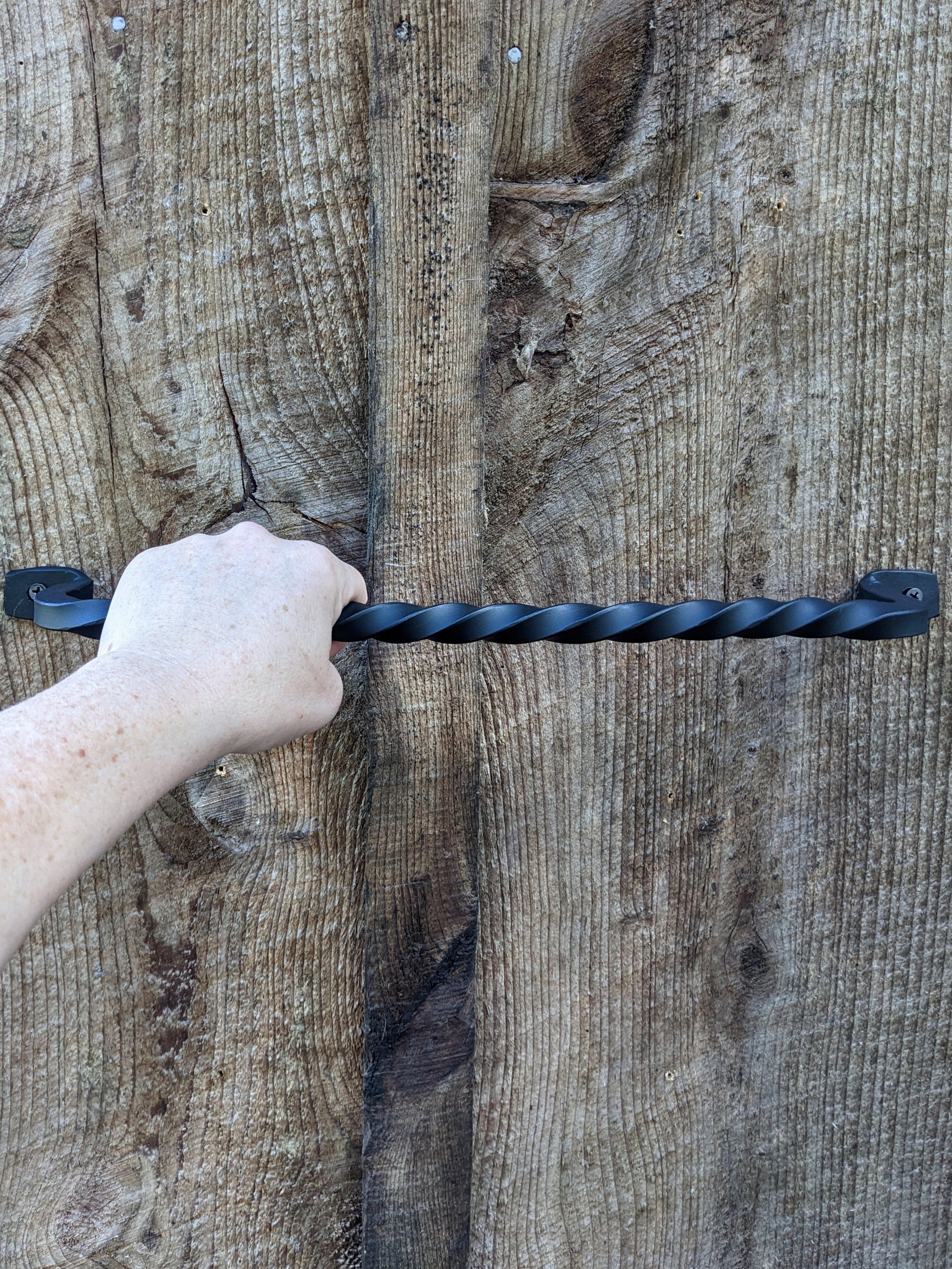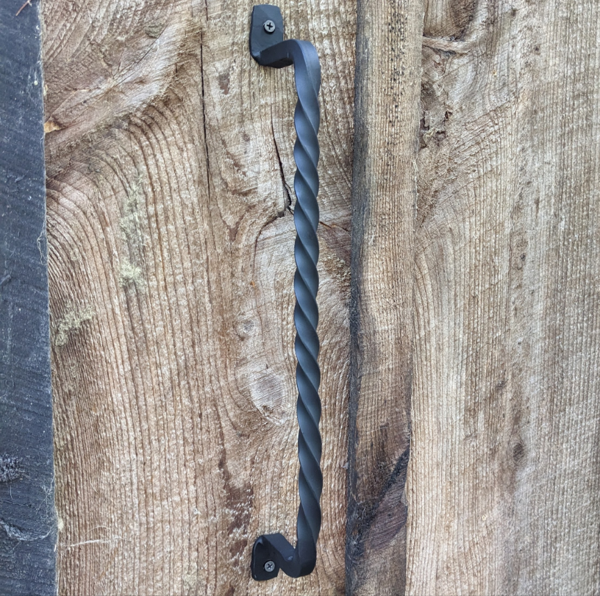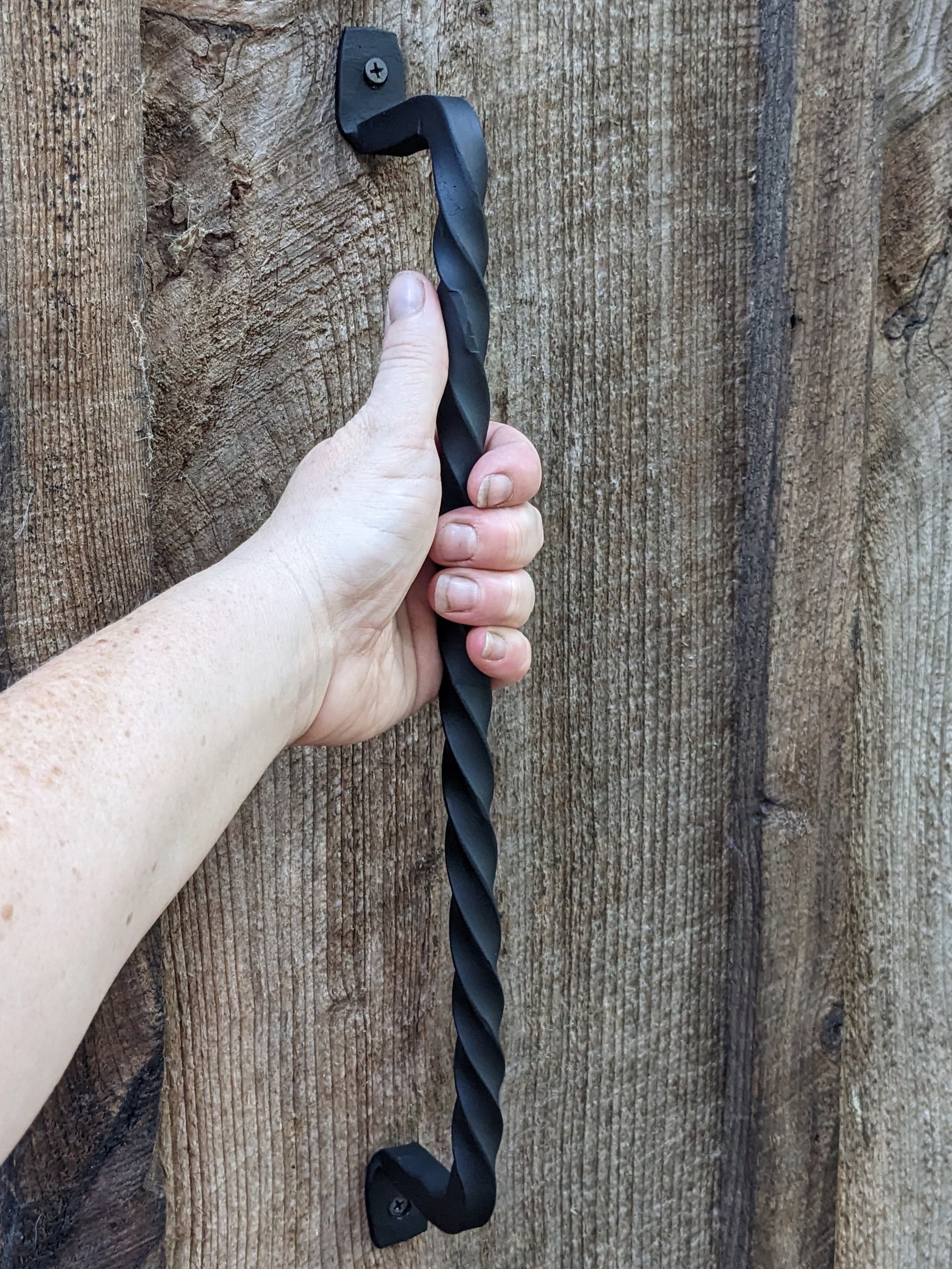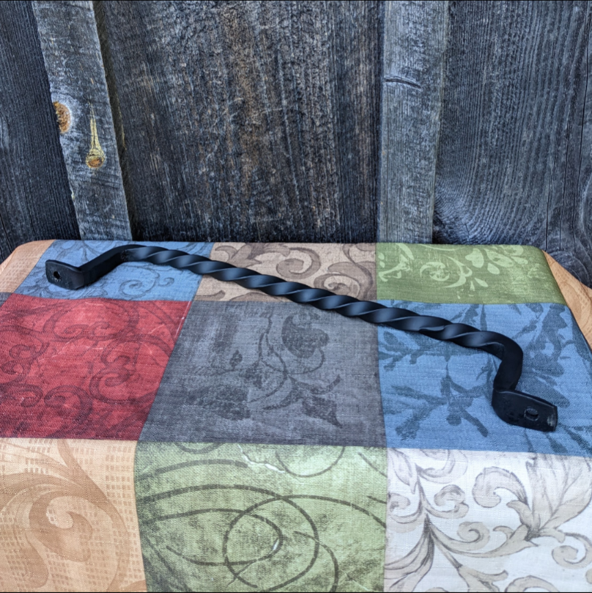 This listing is for a single twisted handle made in the forge here at our family farm. These are made of a solid piece of 1/2" square stock steel which has been shaped into a handle with a twist running the length of the handhold. They measure about 17" in overall length and come away from the wall approximately 2.5". Please note sizes are approximate and will vary slightly as each piece is a handmade original. They are great for large barn or garage doors, or mount them horizontally to use for towel racks or as safety handles for stairs or bathrooms. They come with a flat black finish.