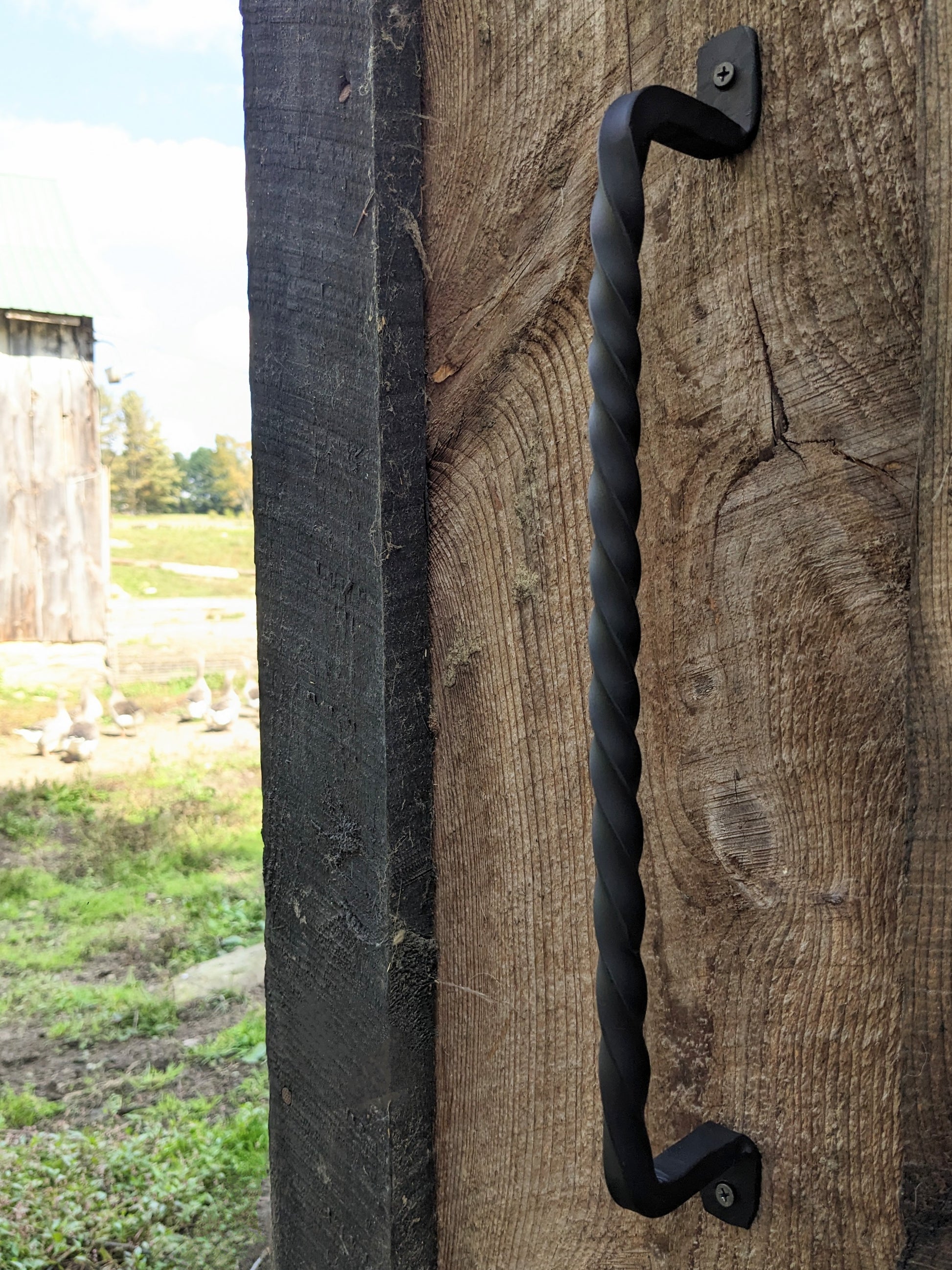 Although each set of handles is made to look like the one pictured, slight differences do occur since each is individually hand made using a fire, anvil, and hammers in our blacksmith shop here on our Pennsylvania farm. All sizes are approximate. Hand forged metal work is handmade to order and requires a two week processing time before shipping. American-made quality designed to last a lifetime and beyond! We also offer these in a standard 11" size and are happy to duplicate this style in custom sizes.