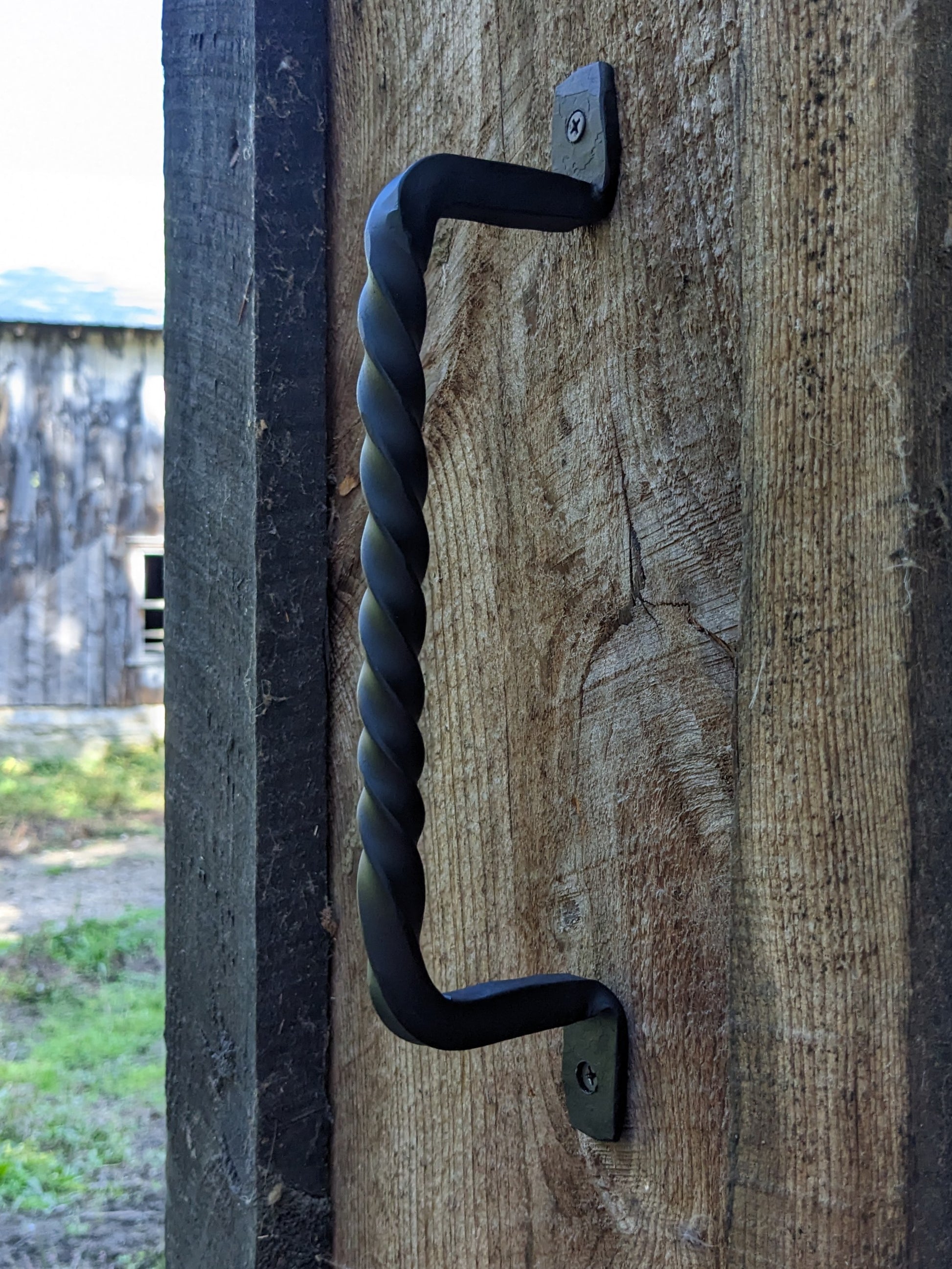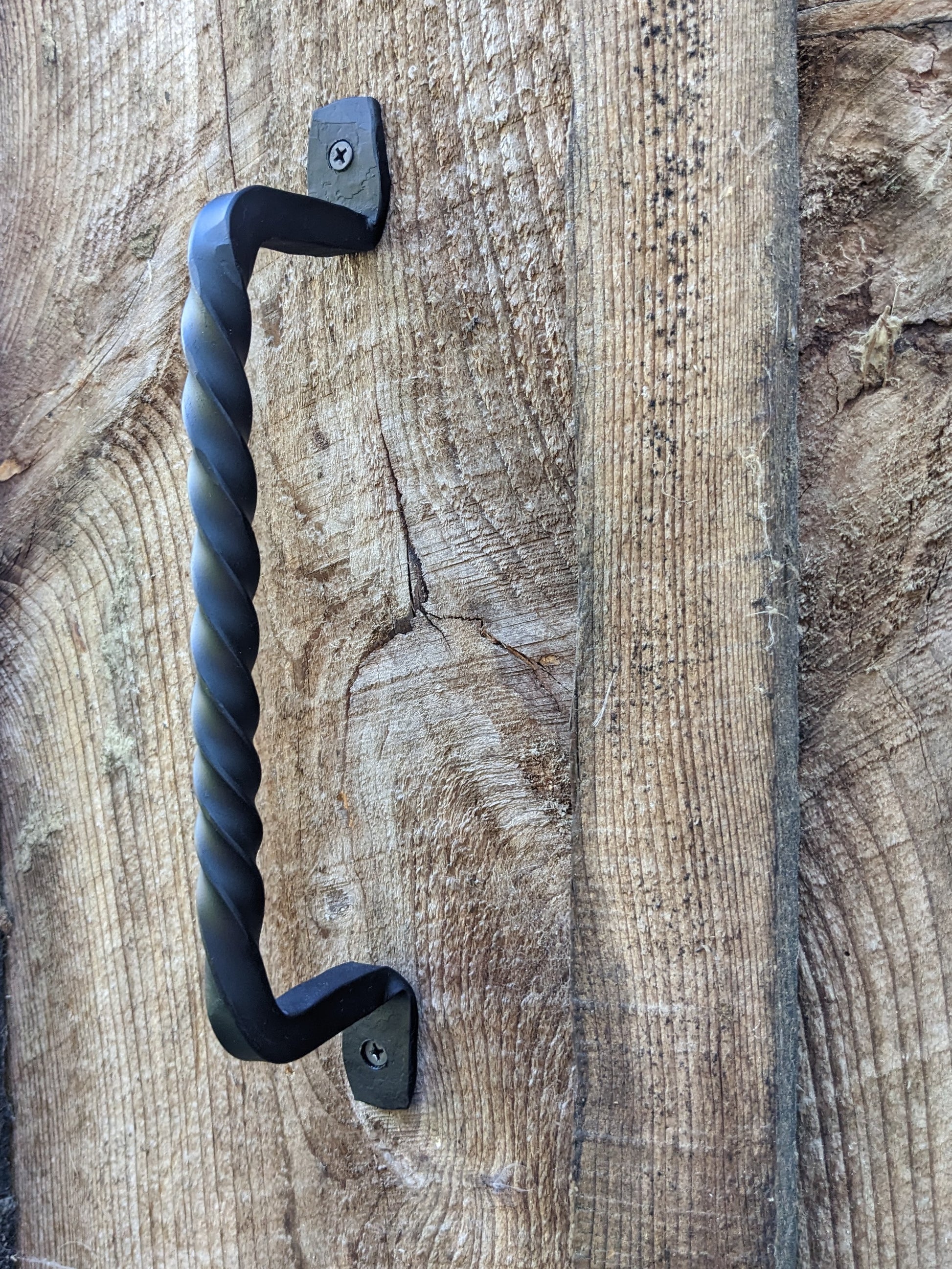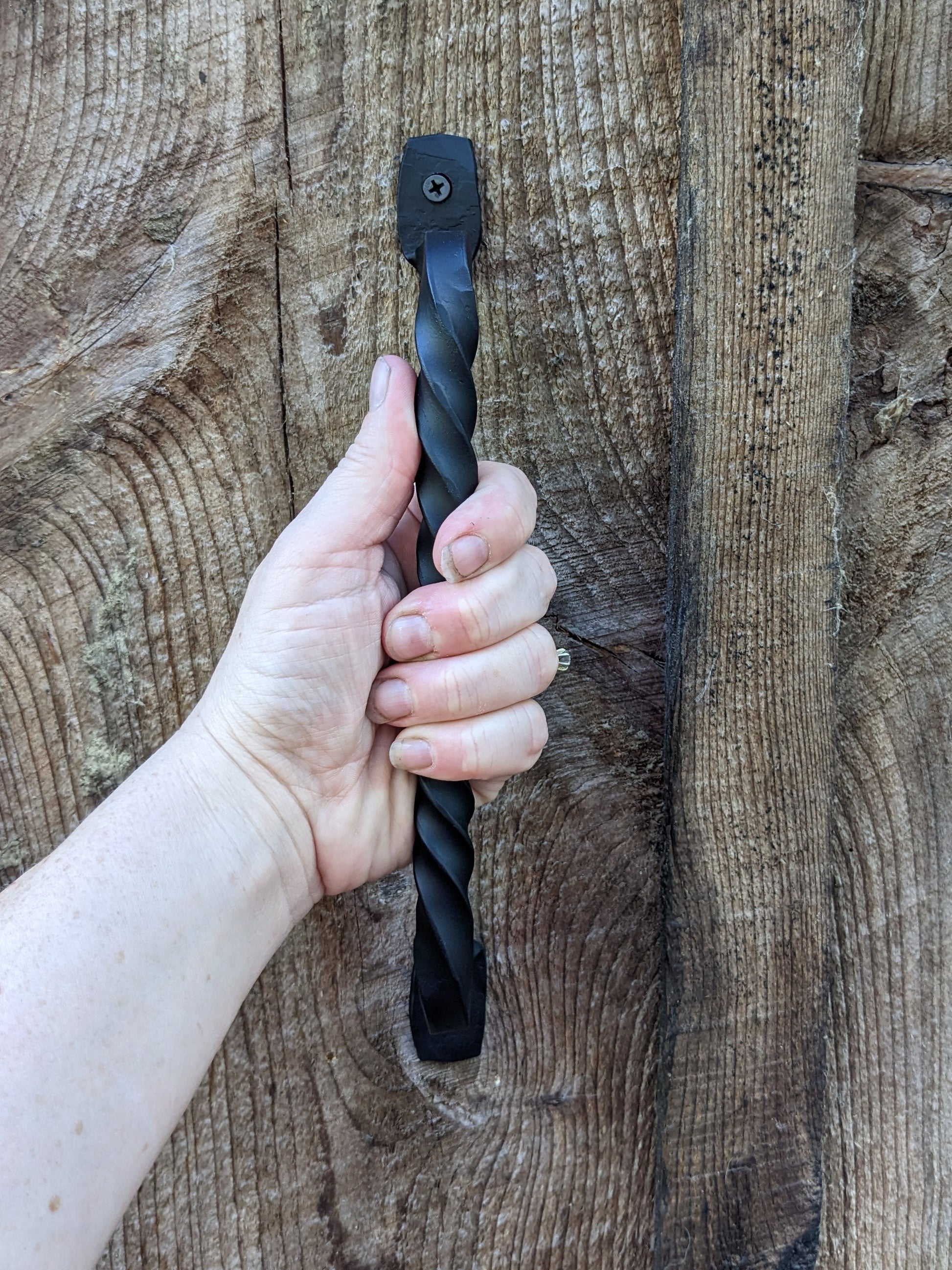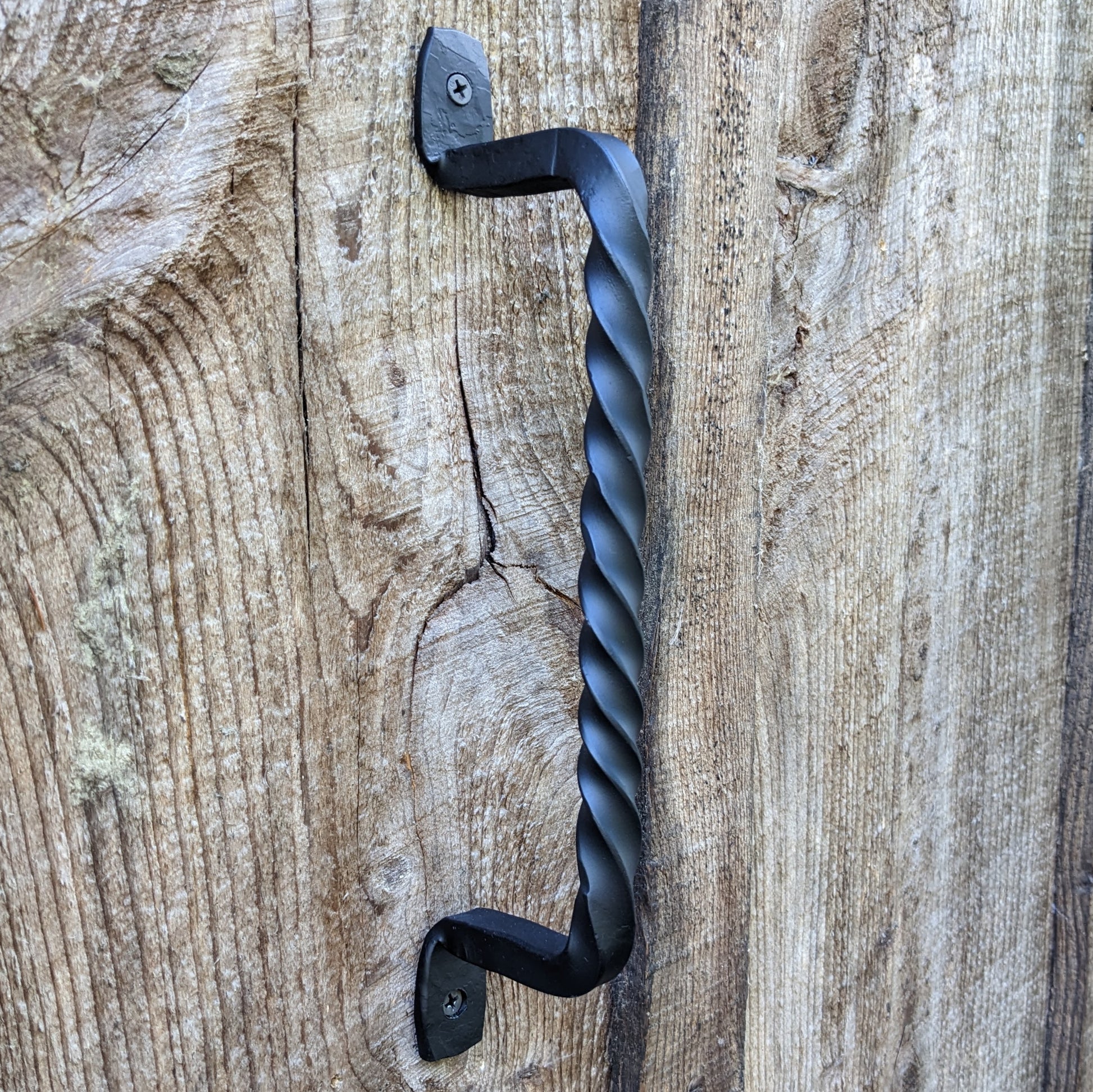 This listing is for a single handle made in the forge here at our family farm. It is made of a solid piece of steel which has been shaped into a handle with a twist running the length of the handhold. It measures about 11" in overall length and comes away from the wall about 2.5". The flat black finish makes it resistant to rust and suitable for indoor or outdoor use. Please note sizes are approximate and will vary slightly as each piece is a handmade original. The pictures are an accurate representation, but you may not get the exact one pictured due to slight differences since they are hand made. We generally make these up as they are ordered, we currently have a 2-week shipping estimate on all orders. We're also happy to do custom work, the handle can be made in different sizes in this style upon request. All our hand-forged metal work is made with a coal fire, anvil, hammers & other hand tools, just as a blacksmith would have used years ago. American-made quality designed to last a lifetime and beyond! We have a listing for this style of handle as a set of two for sale also.