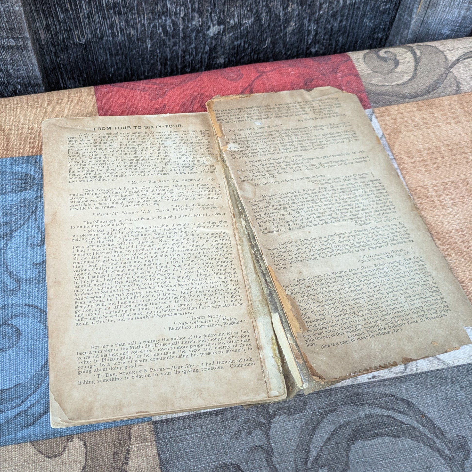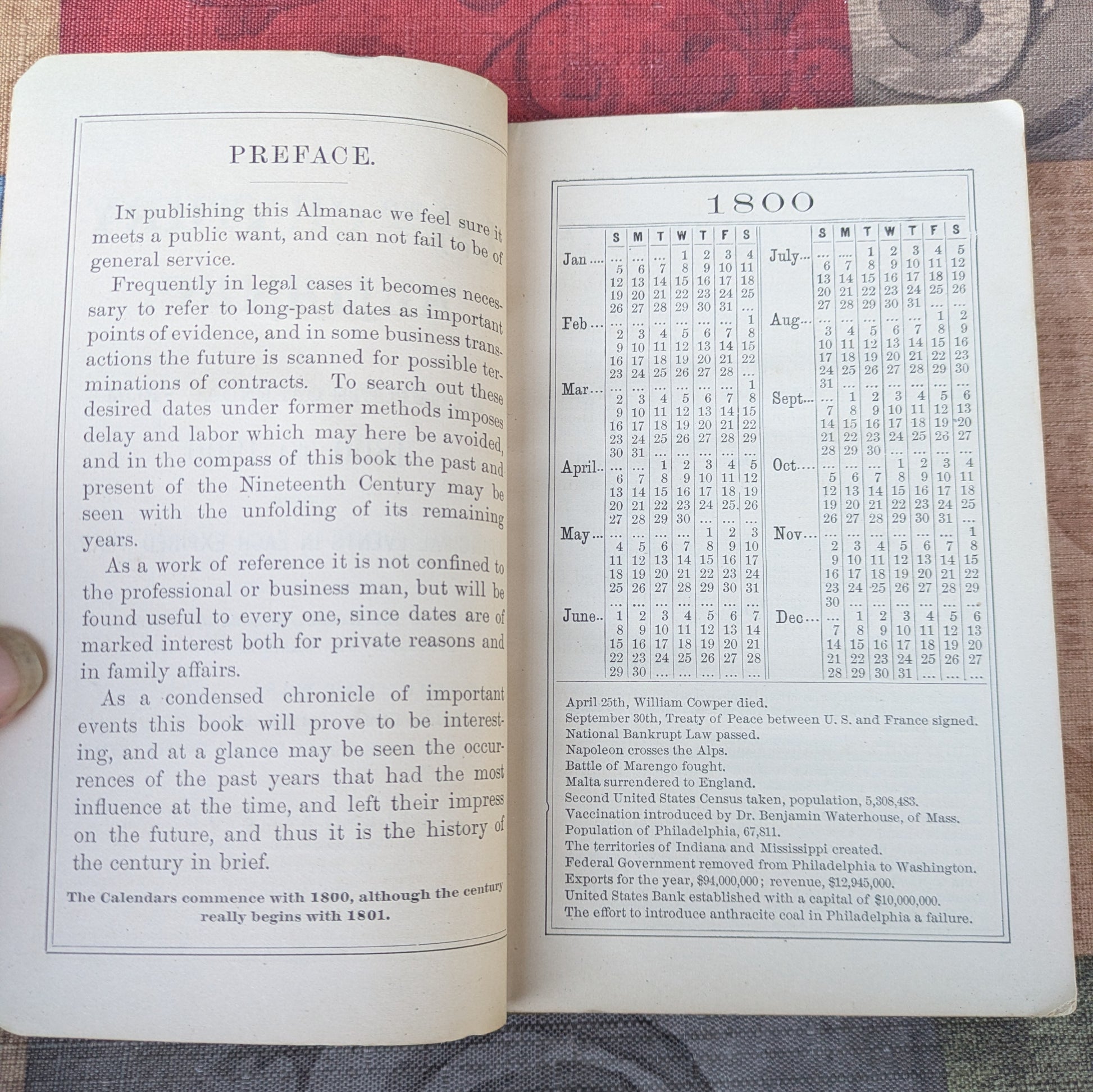 This small volume lists the days of the week for the entire year from 1800-1900 and was intended as a pocket or desk reference. It lists important dates and historical facts. Appears to have been a giveaway item from Drs. Starkey and Palen who advertise "compound oxygen" on the back cover and testimonials of this quack medical treatment inside the cover.