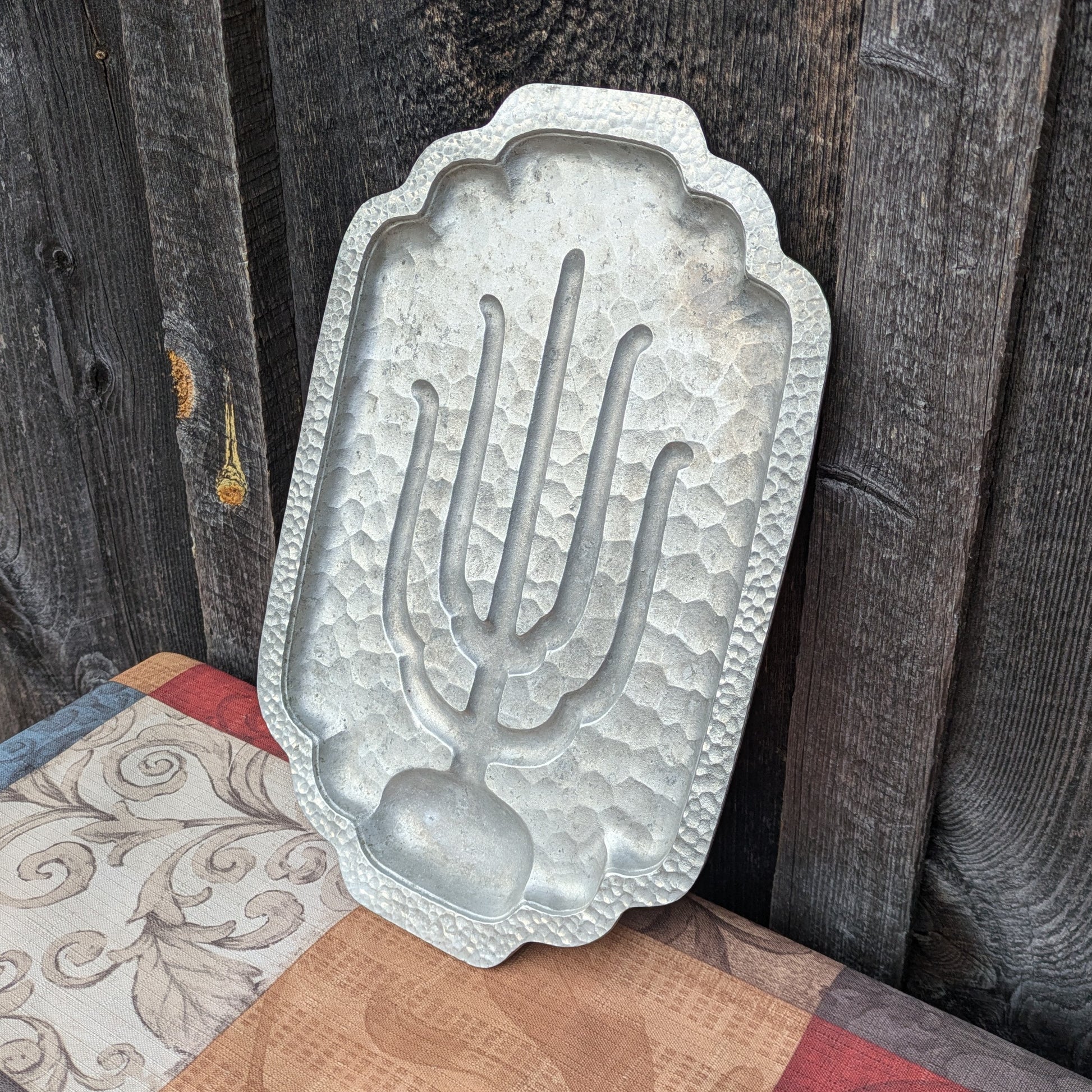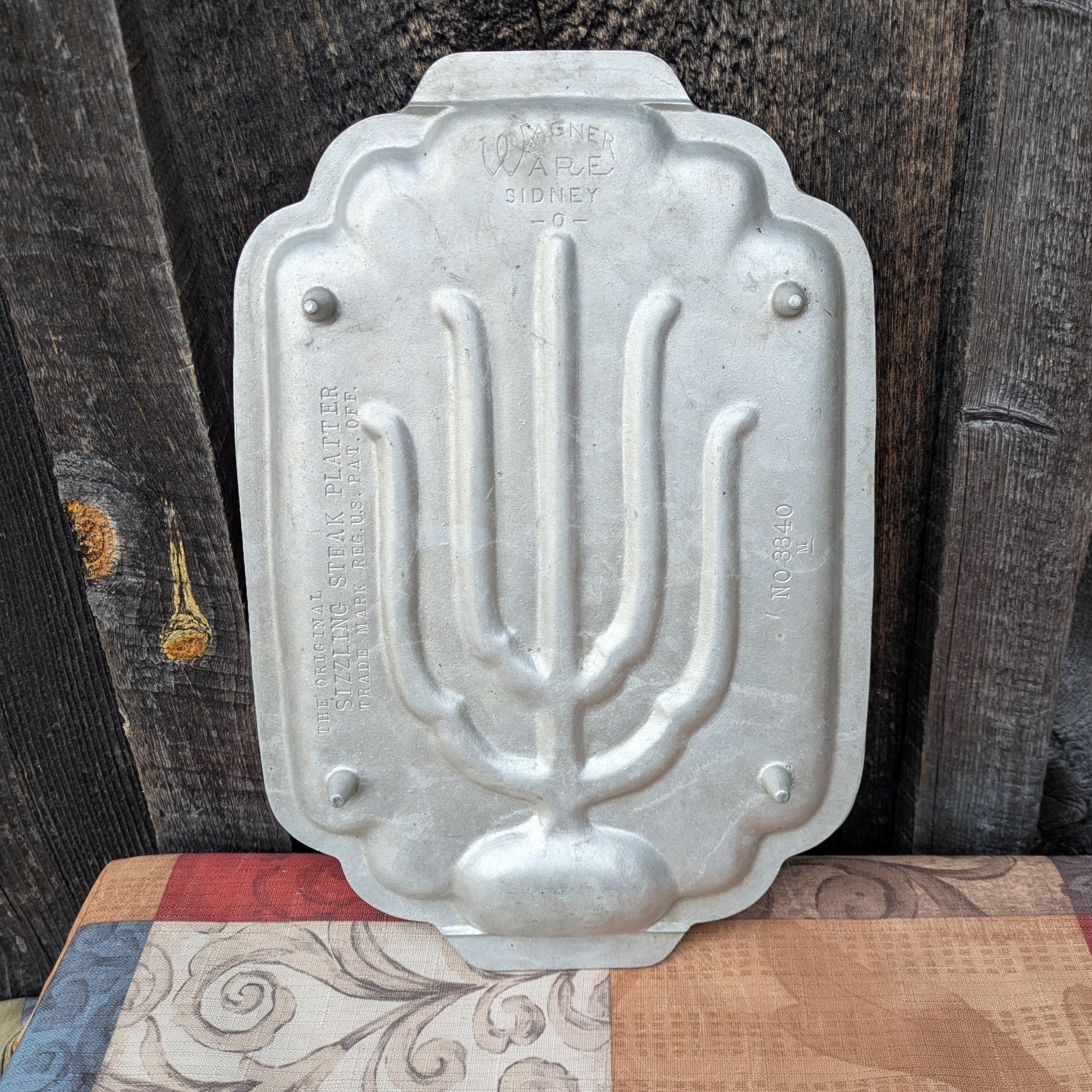 Original Sizzling Steak Platter by Wagner Ware, Number 3340 M. This is the smallest size of the Sizzling Steak platters. Made of cast aluminum in the hammer finish style in Sidney, Ohio in the 1940's.